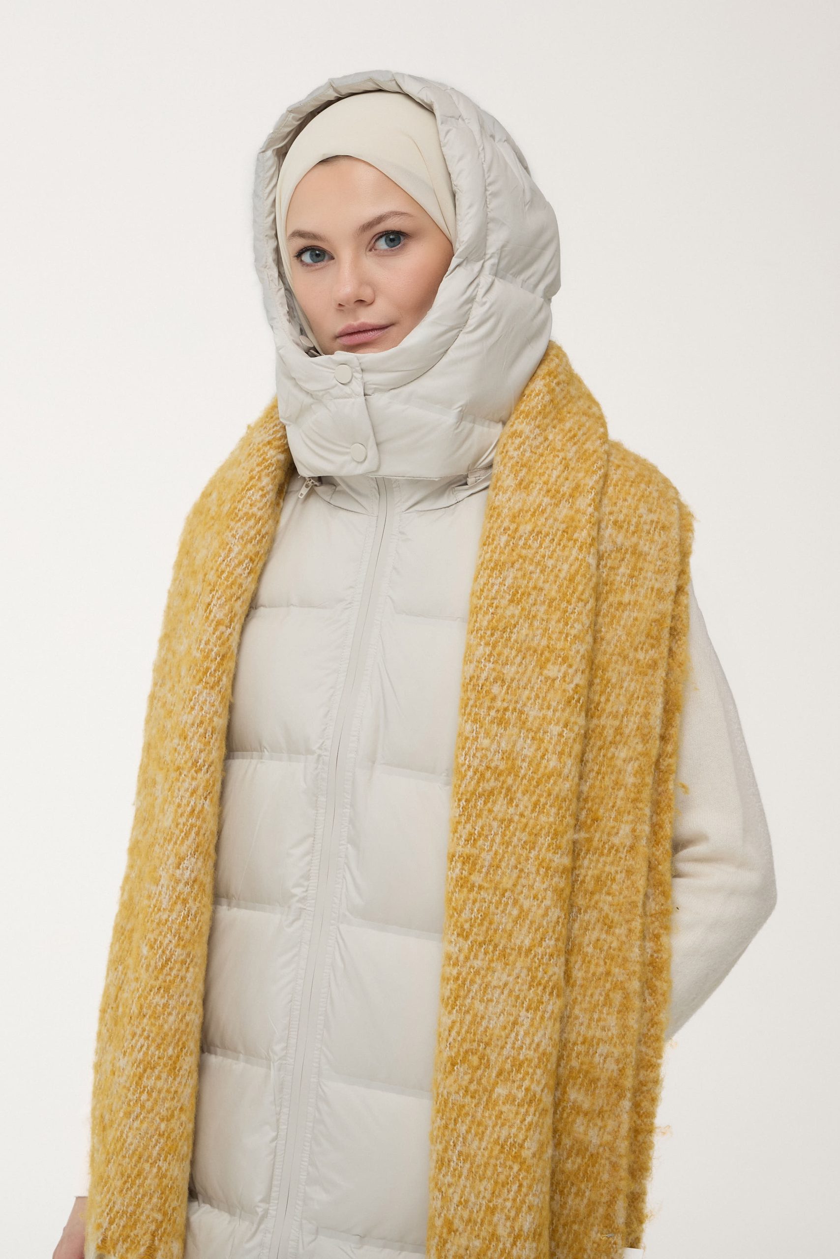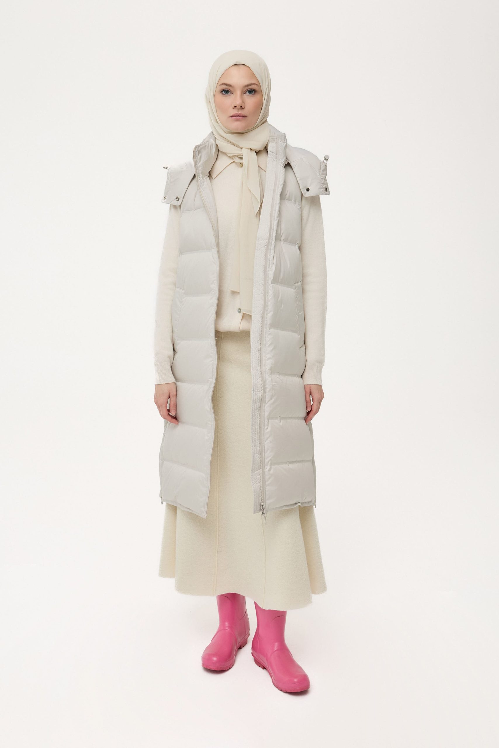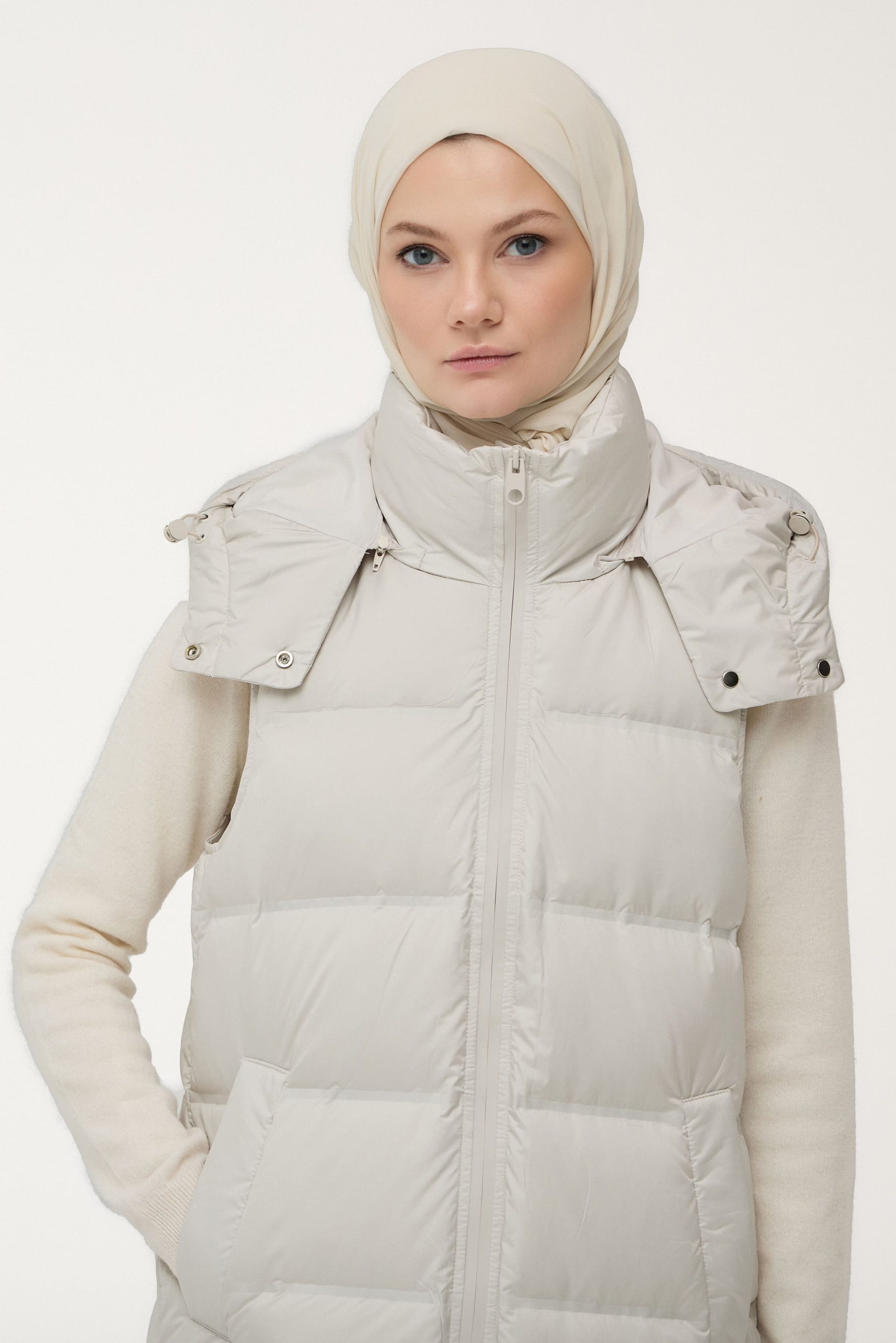 Tags: beige vest, city style, down-filled vest, everyday wear, fashion vest, goose down vest, hooded vest, sleeveless vest, winter vest, women's vest