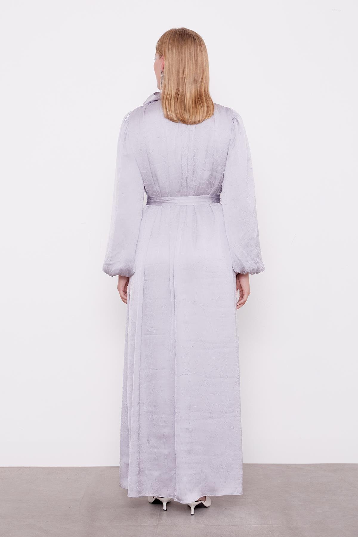 This belted crinkle satin dress is a favorite among fashion enthusiasts, offering a unique design that combines elegance and comfort. The lightly lustrous and textured crinkle satin fabric provides a noble appearance while drawing attention with its dynamic structure. The bow-tie neck detail adds a delicate sparkle to the dress, while the soft texture of the crinkle satin ensures all-day comfort. Perfect for office elegance or evening events, this versatile piece is ready to become a wardrobe staple. Pair with elegant heels, a simple clutch bag, and natural-toned makeup for a stunning look. For a sophisticated appearance, style with seasonal accessories like a new-season scarf or lightweight jacket.