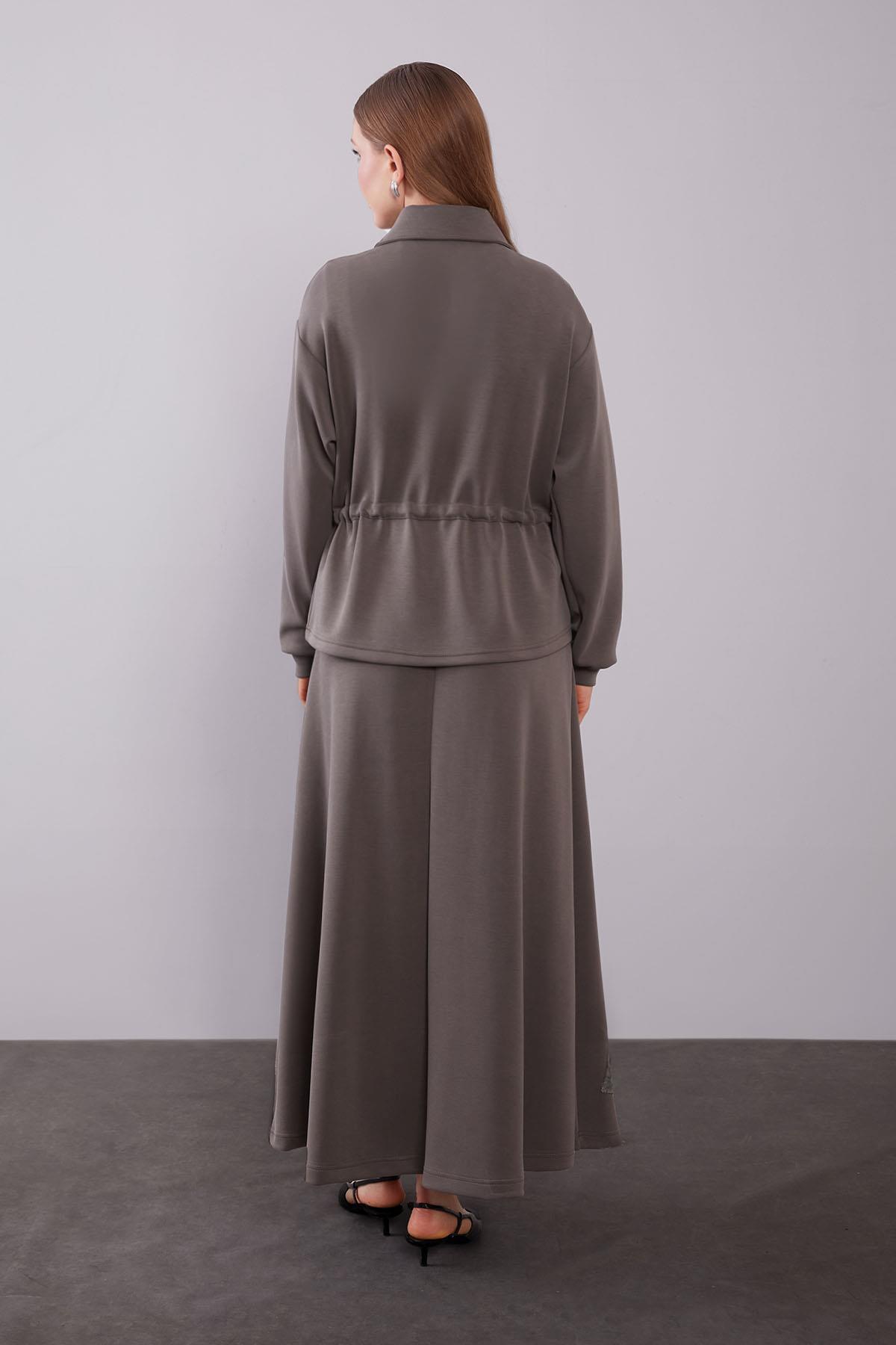 Gray Pleated Patch Detail Skirt Set