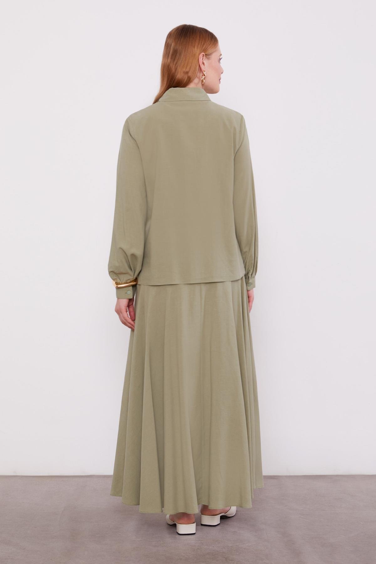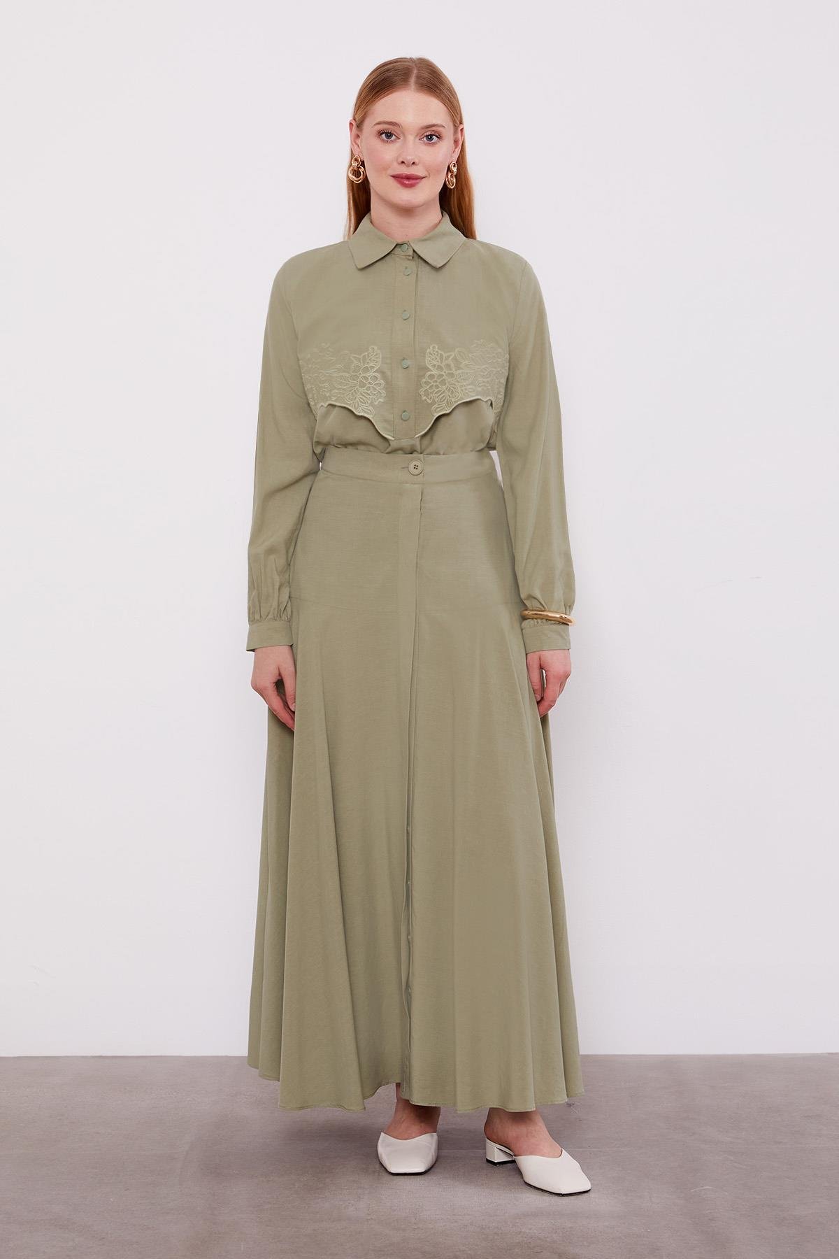 This embroidered detail cupra skirt set design, with its sophisticated silhouette and refined details, becomes an ideal choice for those who want to display elegant poise in any setting. It’s a favorite among women who desire both comfort and style in the hustle and bustle of daily life. Its breathable fabric offers a fresh feel especially during spring and summer months. You can easily pair it with sneakers, flats, or heels to instantly elevate your everyday style.