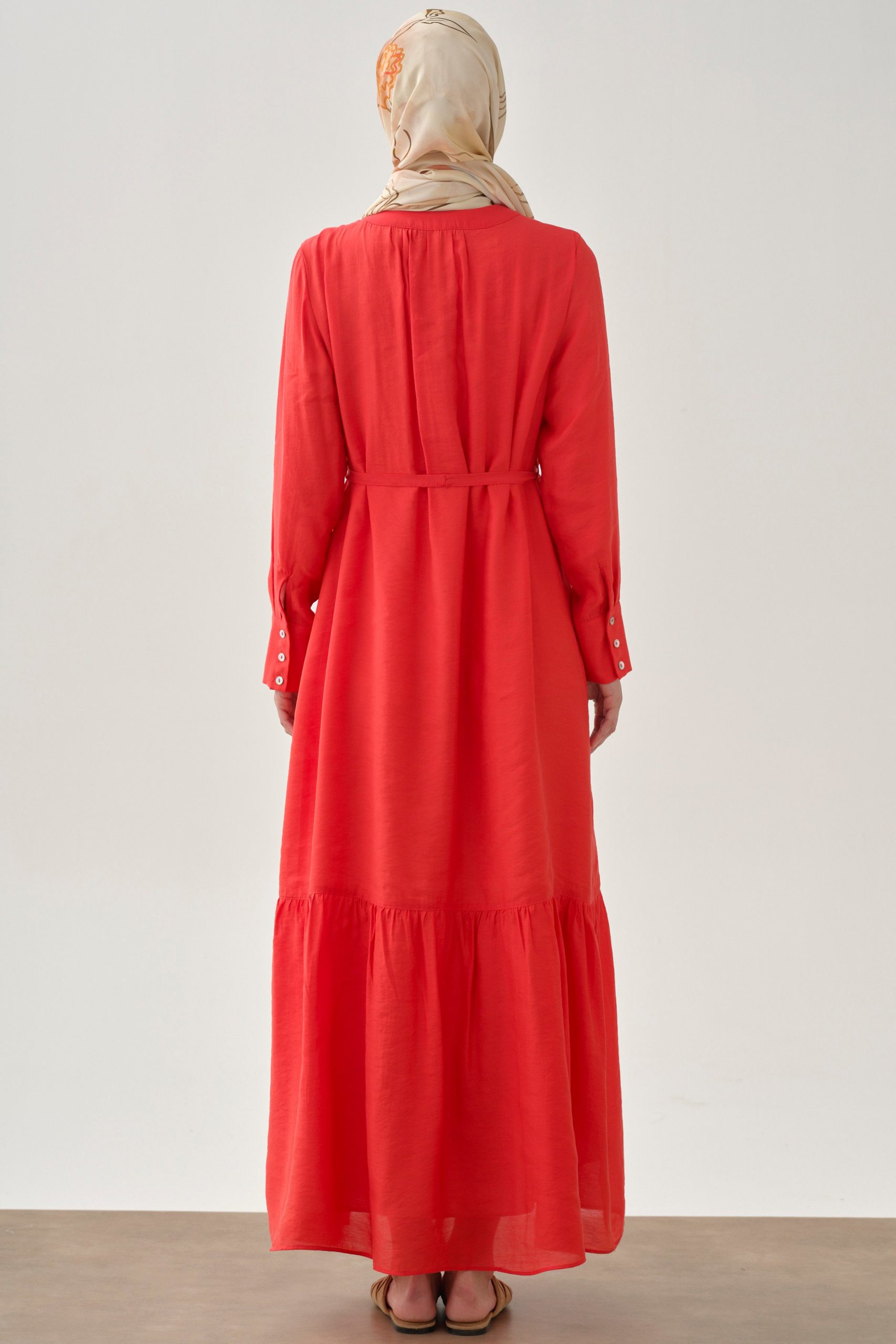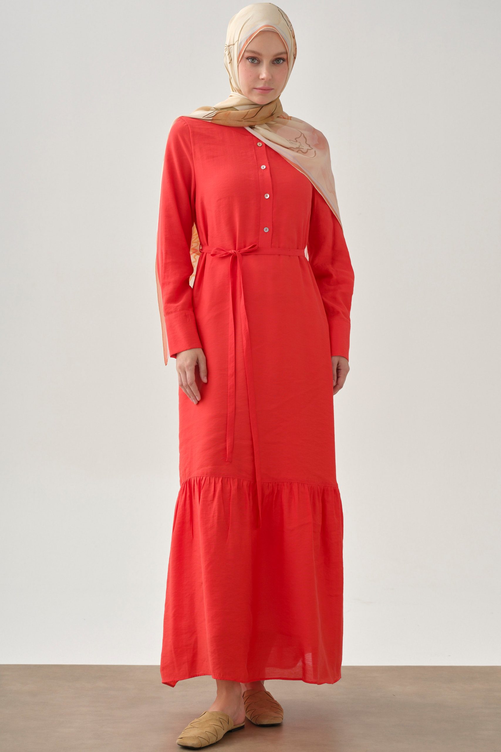 Half-Placket Gathered Skirt Dress – Coral