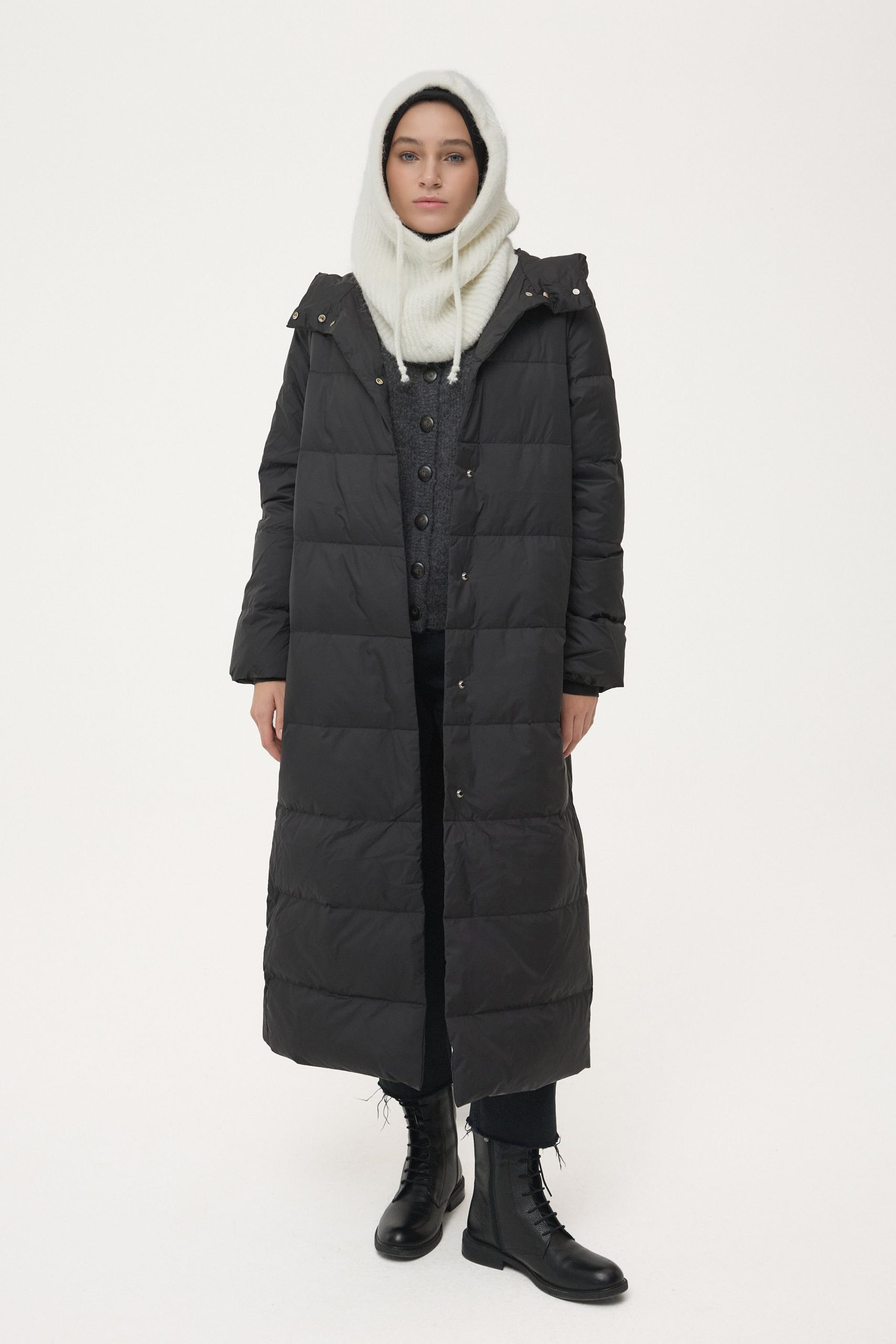 Tags: down jacket, elegant outerwear, goose down, hidden closure, minimalist design, winter coat