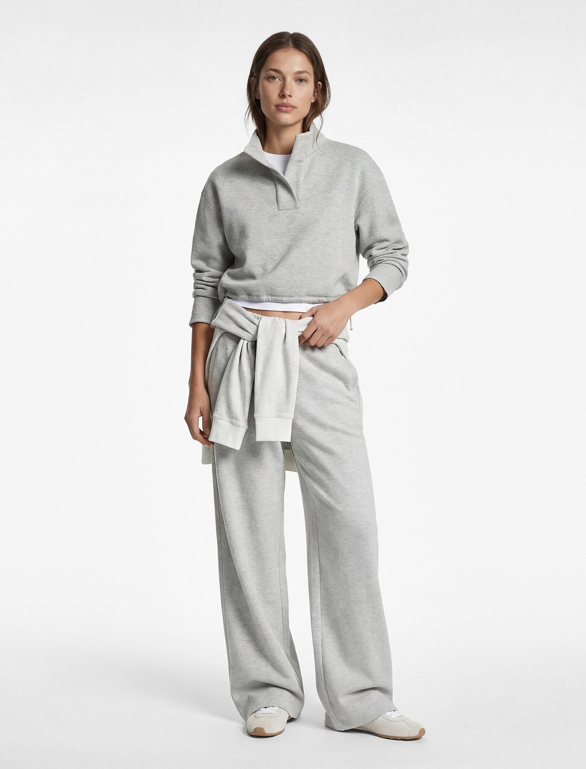 This sports oversize sweatshirt adds comfort to your daily style with its sporty and basic design. The long sleeves and high neck provide extra protection on cold days. The snap-button detail offers practicality with easy wear and removal. Its soft fabric and relaxed fit ensure all-day comfort, while the standard length pairs perfectly with any bottom wear. A versatile piece suitable for both sports activities and everyday life, it’s destined to become a wardrobe essential.