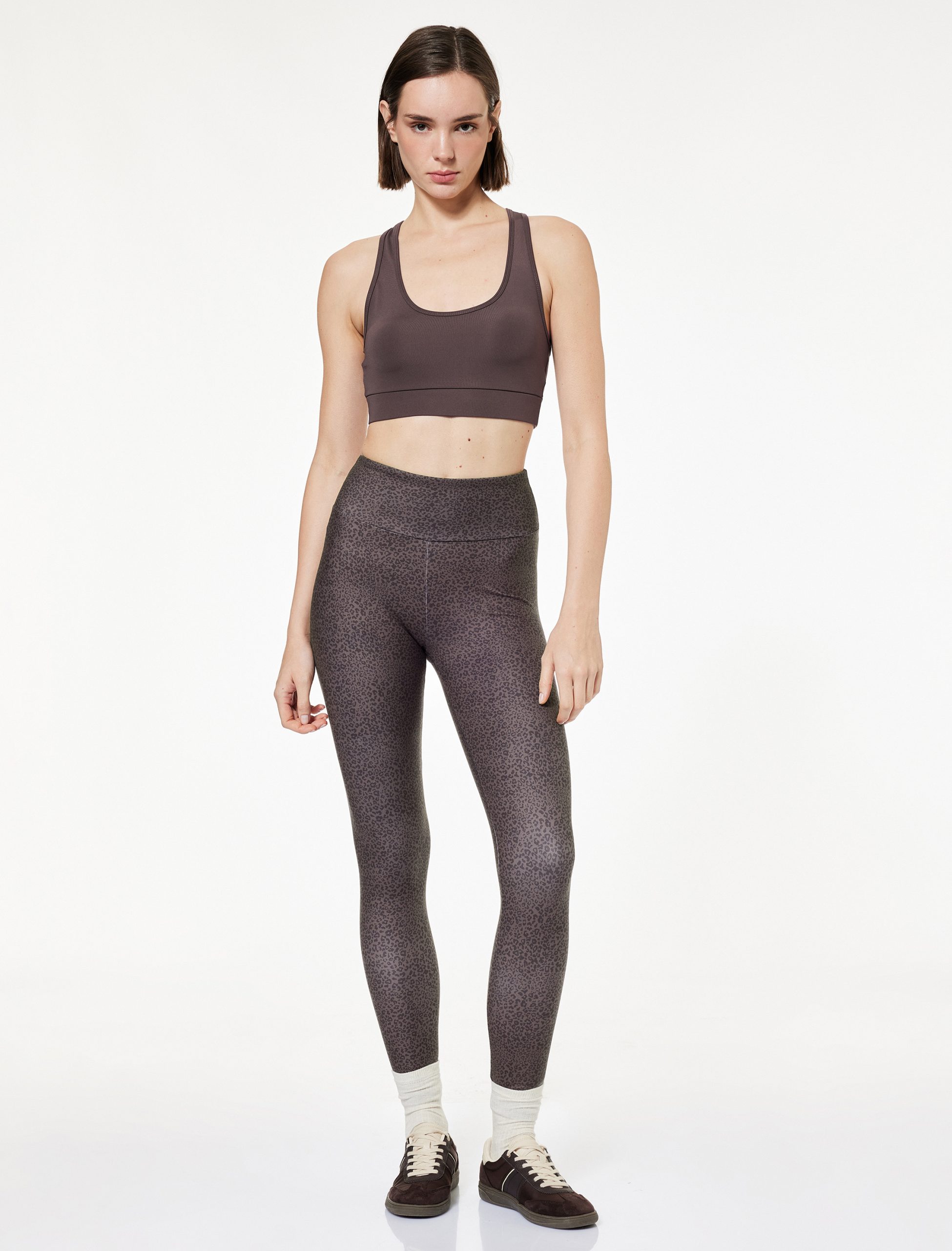 These high-waist leggings combine style and comfort in sportswear with their slim fit cut. Featuring an interlock fabric structure that offers a flexible wearing experience, the leggings gently wrap and support your body with their high waist. With their ankle-length design and patterned aesthetic, this piece creates an ideal option for your daily sports activities. With its soft texture and modern appearance, these leggings will become an indispensable part of your wardrobe, successfully becoming the key piece of sporty elegance.
