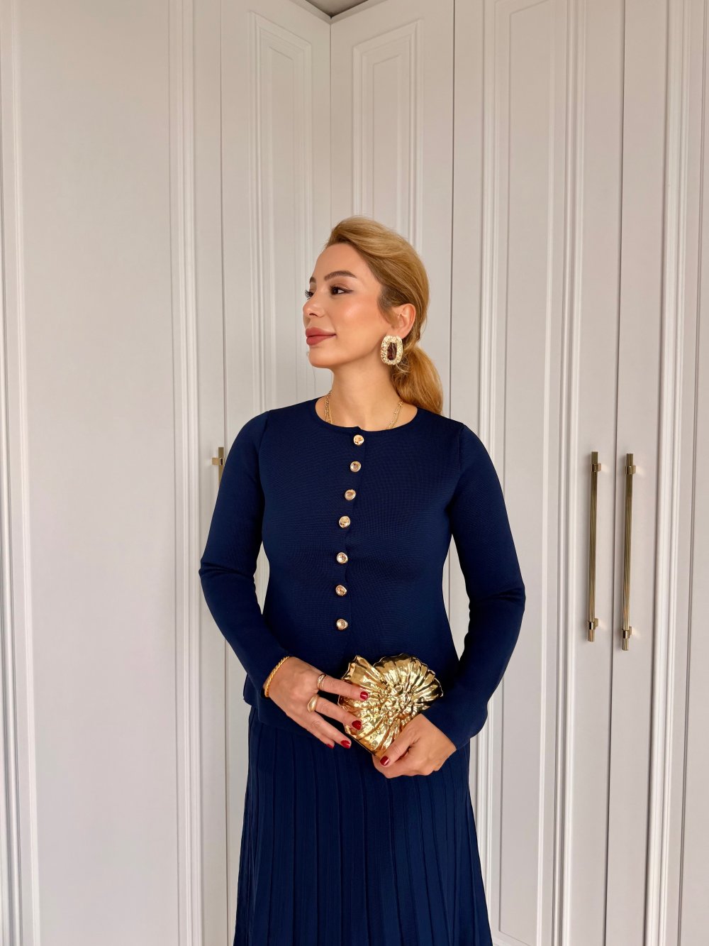 Tags: elastic waistband, navy blue, pleated, skirt, suit