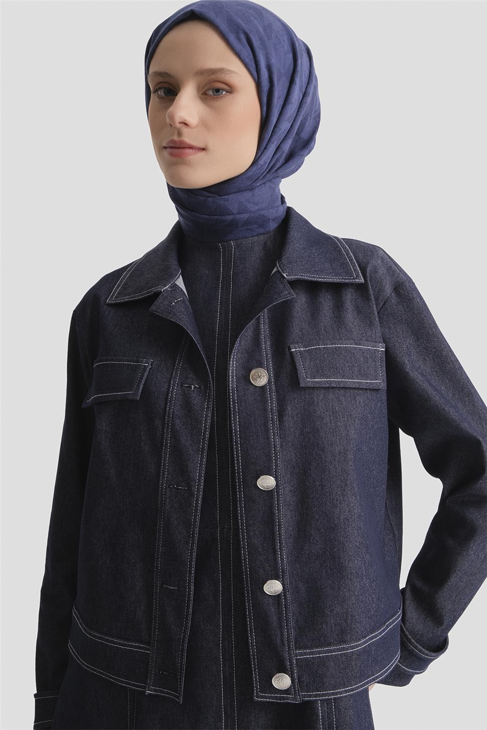 Tags: denim dress set, elegant silhouette, indigo jacket dress, structured jacket, timeless design, urban fashion