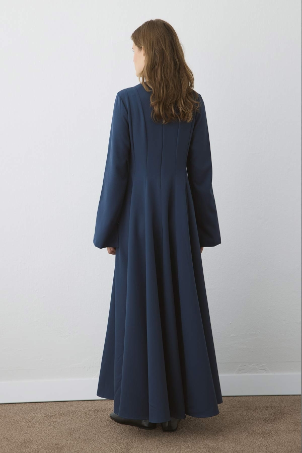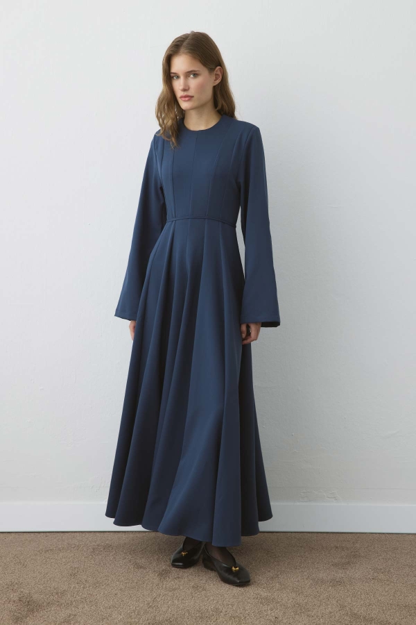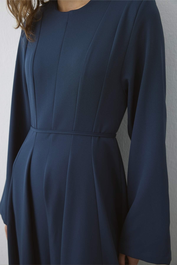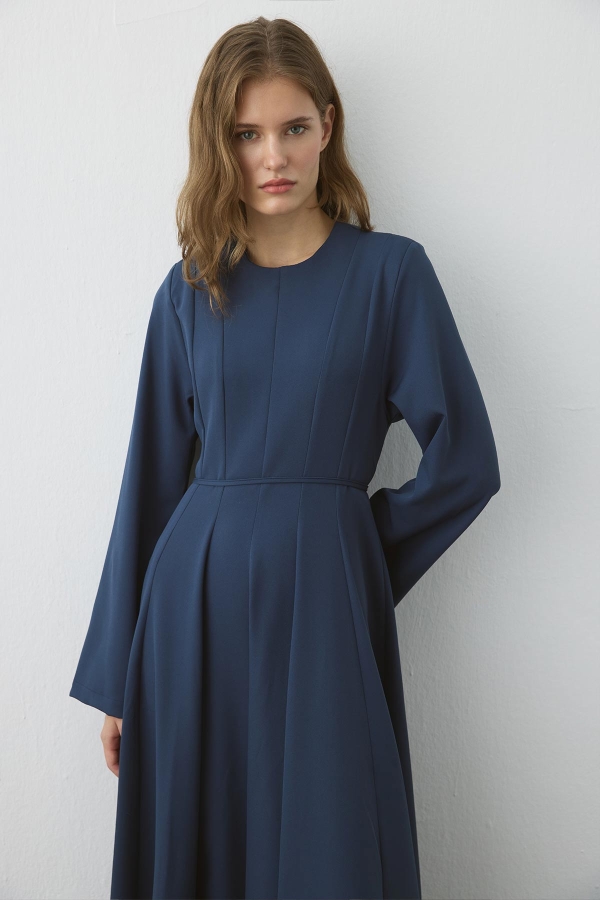FEATURES OF THE INDIGO DRESS WITH WAIST SEAM DETAIL: Crew neck, back zipper closure, self-fabric tie belt, small slit detail on sleeves, paneled cut, full fit, unlined dress with waist seam detail. CONTENT AND CARE: 95% Polyester, 5% Lycra. Should be washed at 30°C on delicate, synthetic, and gentle cycles. Hand measurements may vary by 2-3 cm. Model Size: S-M. Model Measurements: Height: 174 cm, Bust: 78 cm, Waist: 58 cm, Hips: 87 cm.