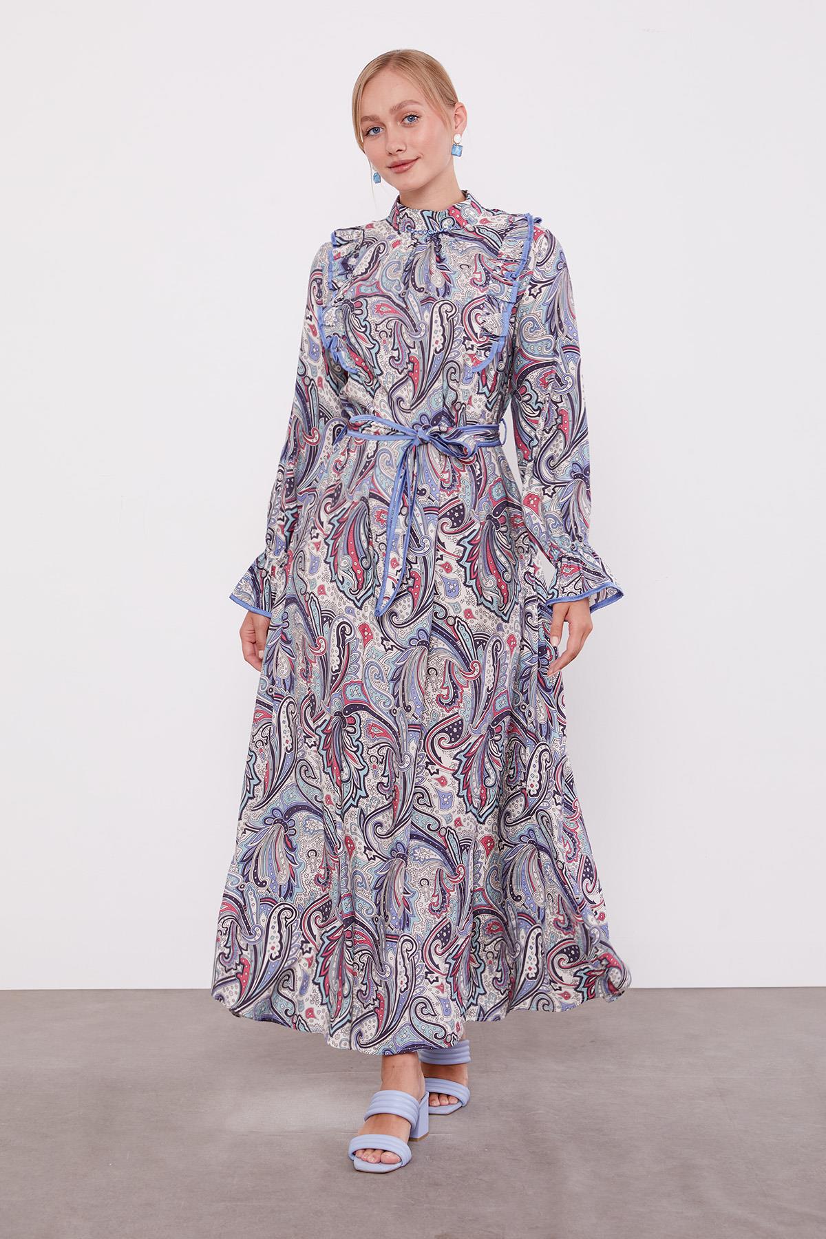 Ethnic patterns consist of motifs that carry traces of different cultures. When combined with ruffled details, these patterns give the dress a bohemian flair. Ruffled ethnic pattern dresses become favorites for women who want to look both comfortable and stylish in daily life. With their pastel colors and unique patterns, they maintain their place in your wardrobe every season. The ruffles create movement in the dress, appearing to dance as you move. Ruffles used particularly at sleeve ends and the bust line highlight your elegance. You can achieve a chic and sophisticated look by pairing our dress with a crinkled shawl and minimal jewelry.