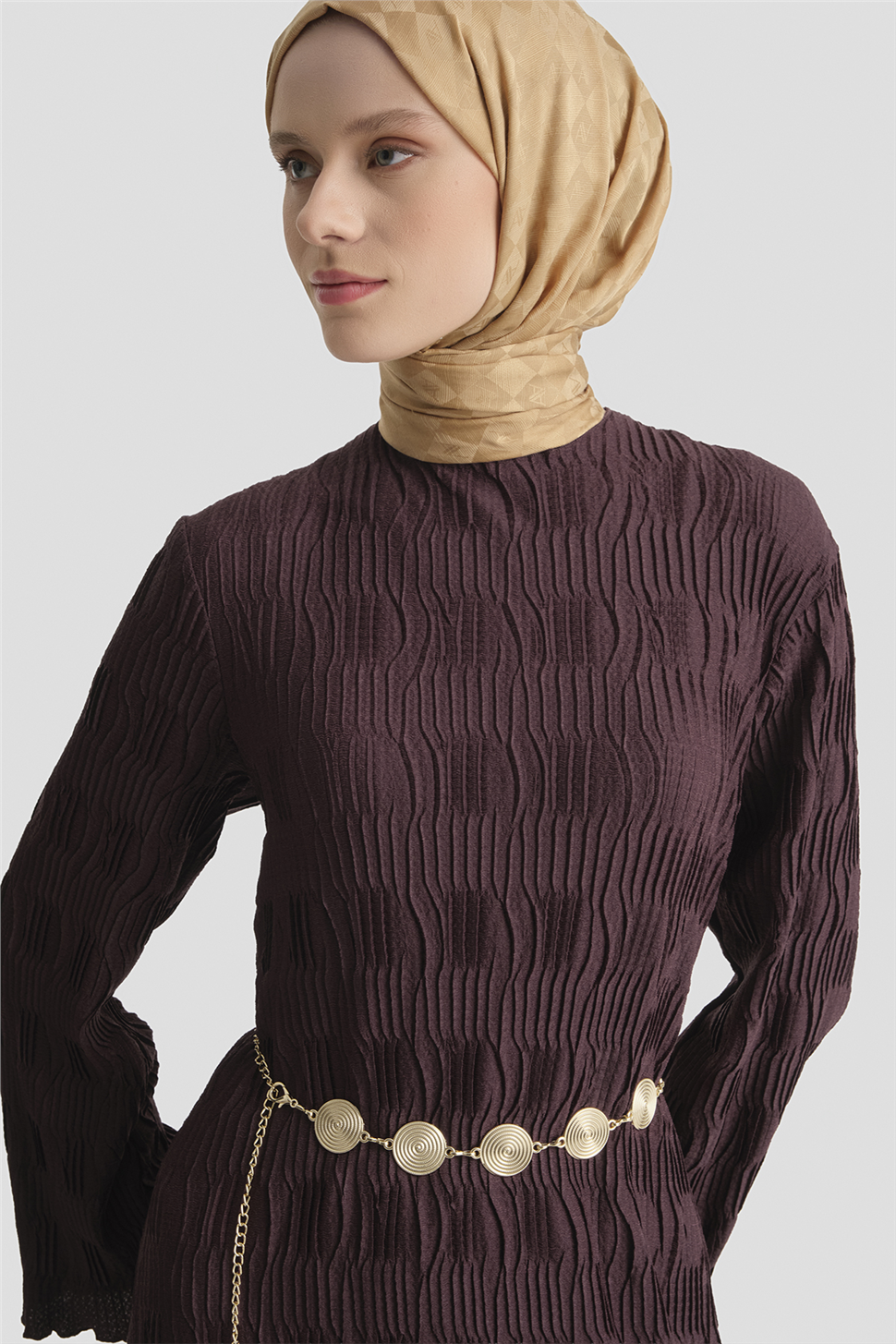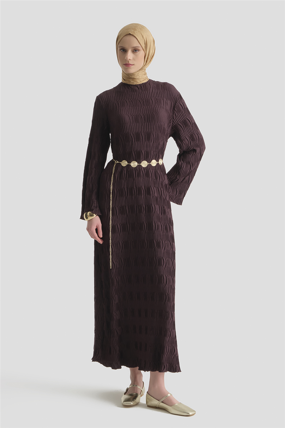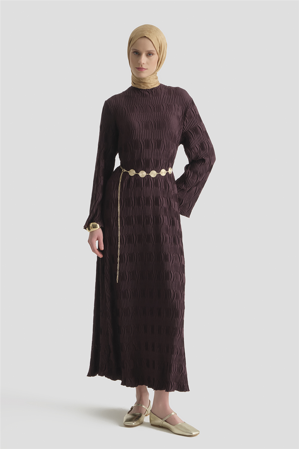 This dress stands out with its elegant jacquard texture and flawless knit form, interpreting simple elegance with a sophisticated posture. With its fluid silhouette and balanced cut, it offers a modern, timeless, and premium style.