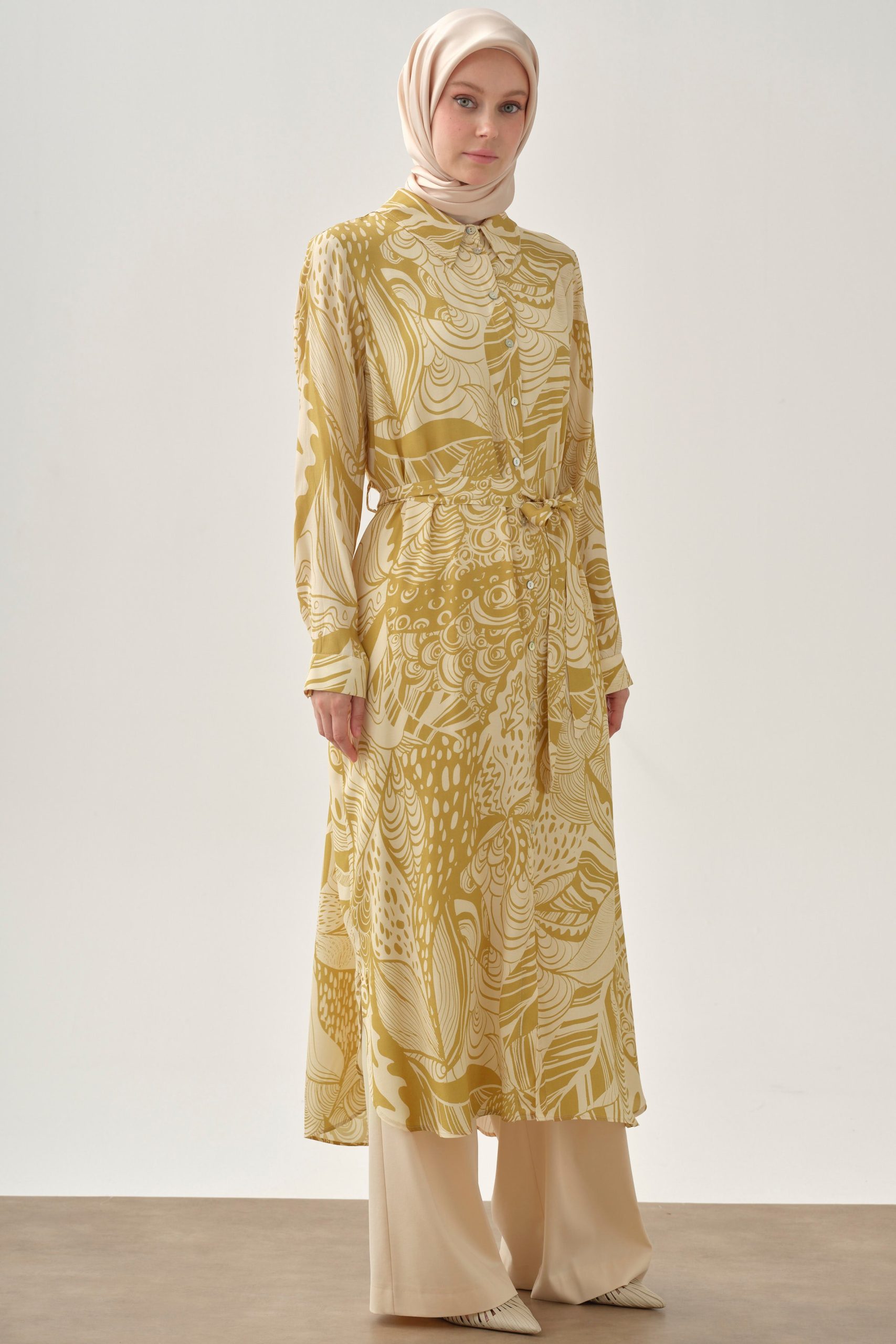 Zarif desenleri ve bel kısmındaki kemer detayıyla feminen bir siluet sunan bu uzun tunik, şıklığı ve rahatlığı bir arada sunar. Günlük ya da özel kombinler için ideal bir tercihtir.