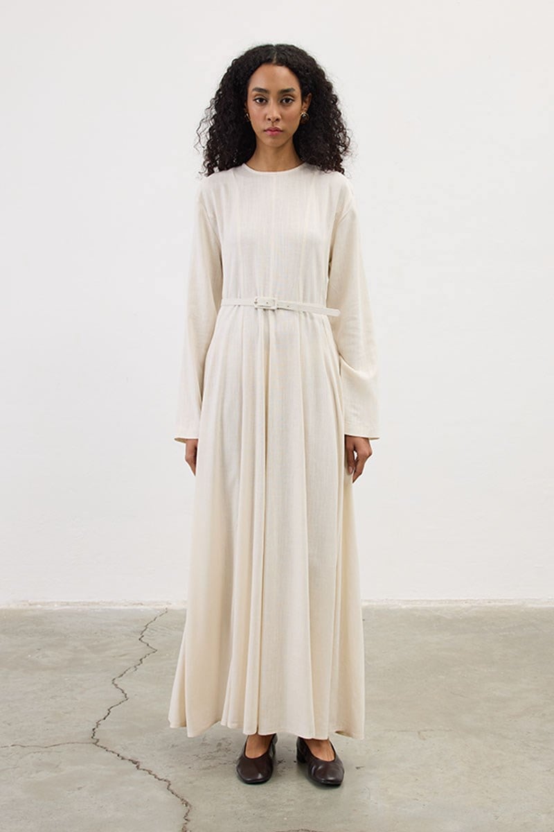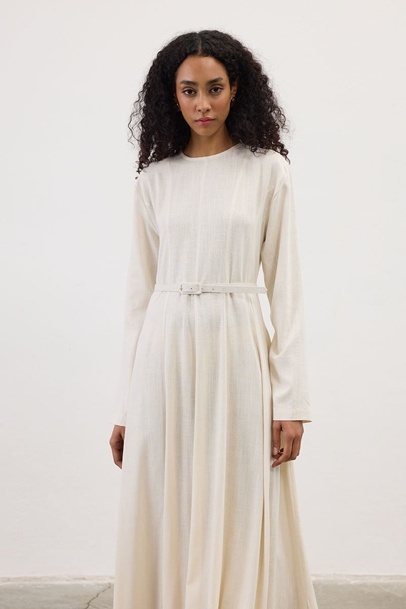 Kemerli Keten Elbise Krem