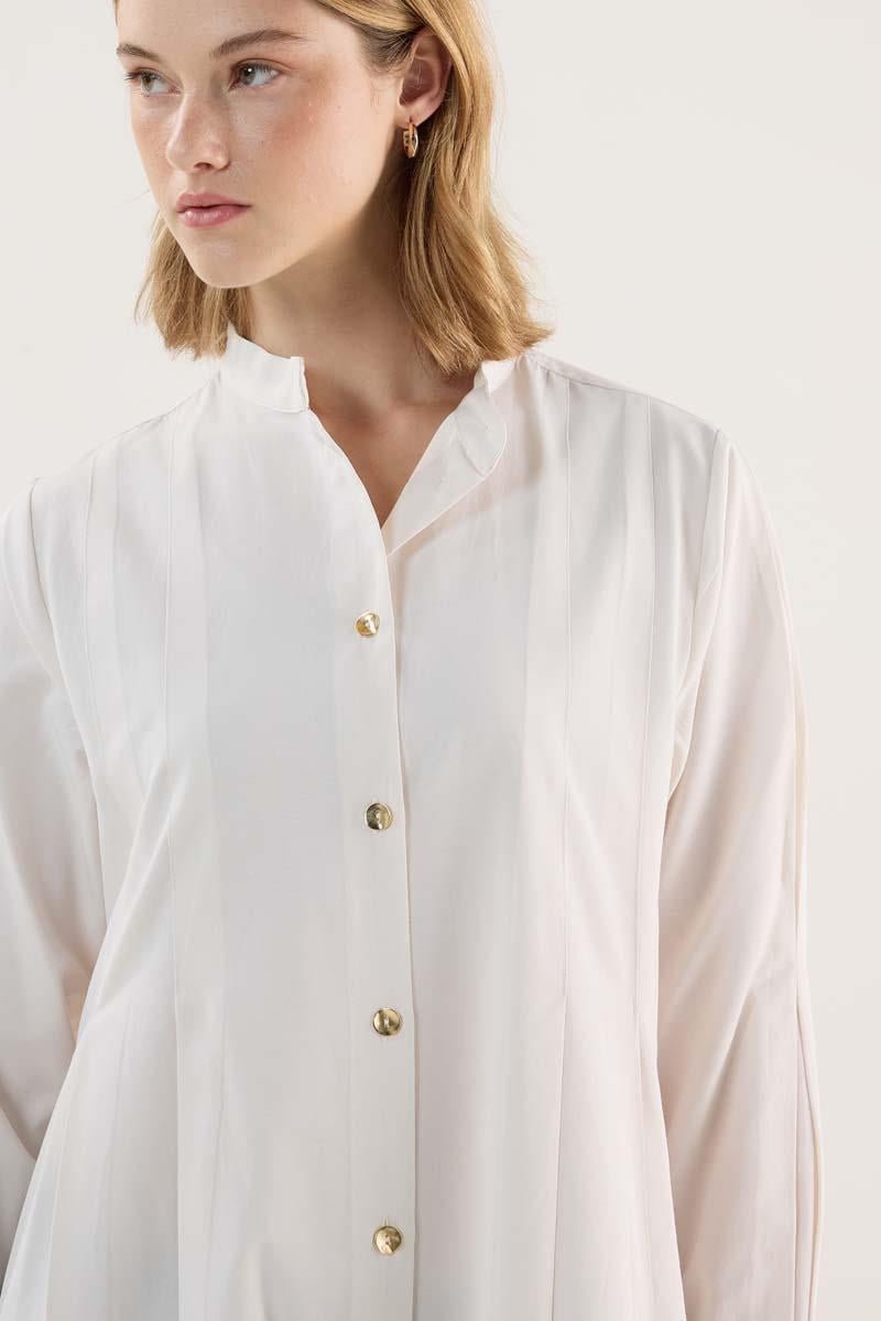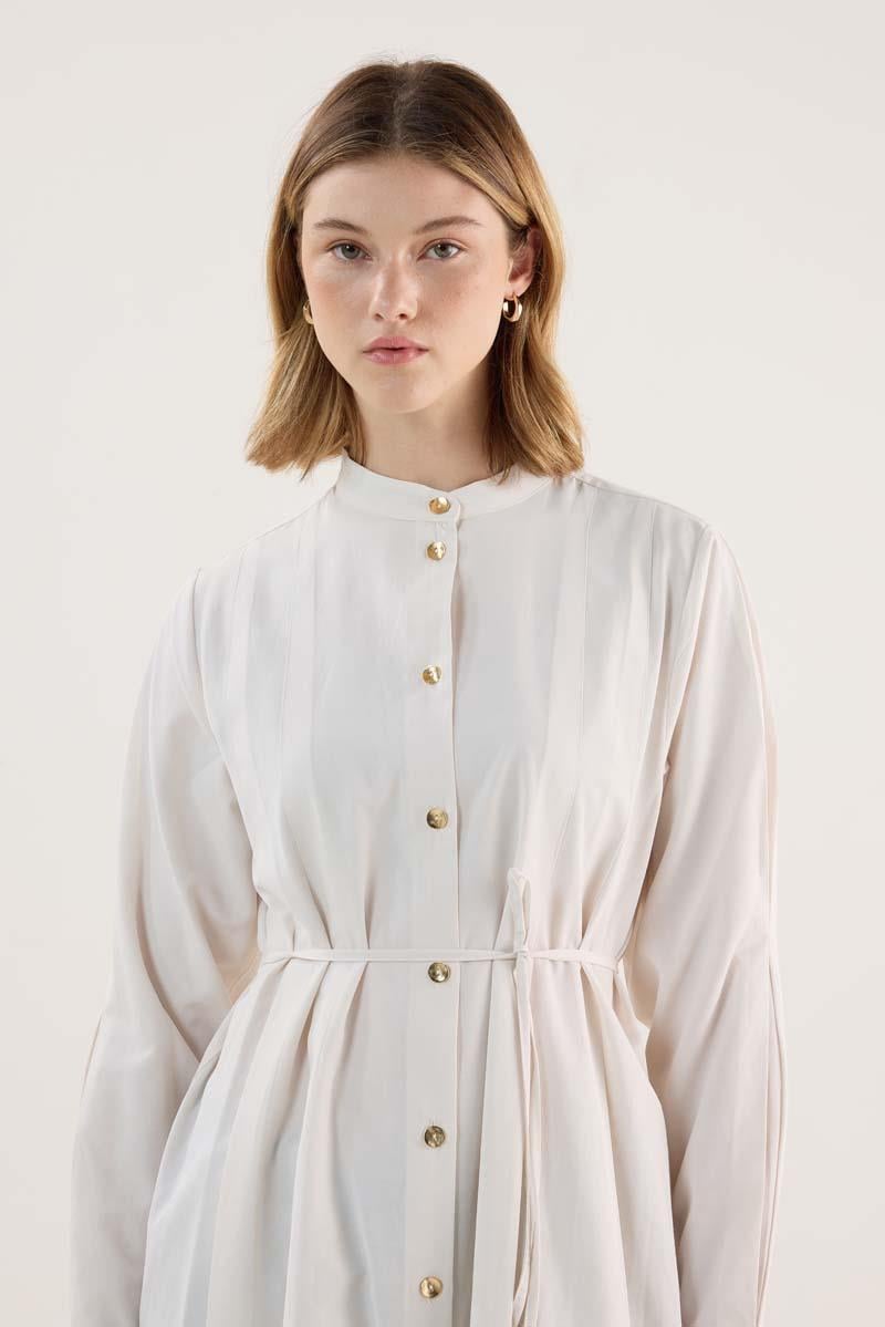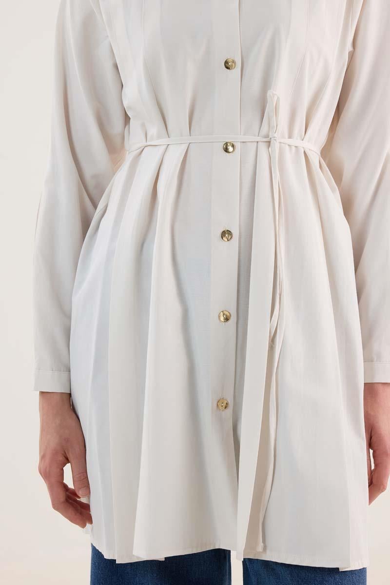 Pleated Neck and Sleeves Tunic with Brooch Detail – Light Blue