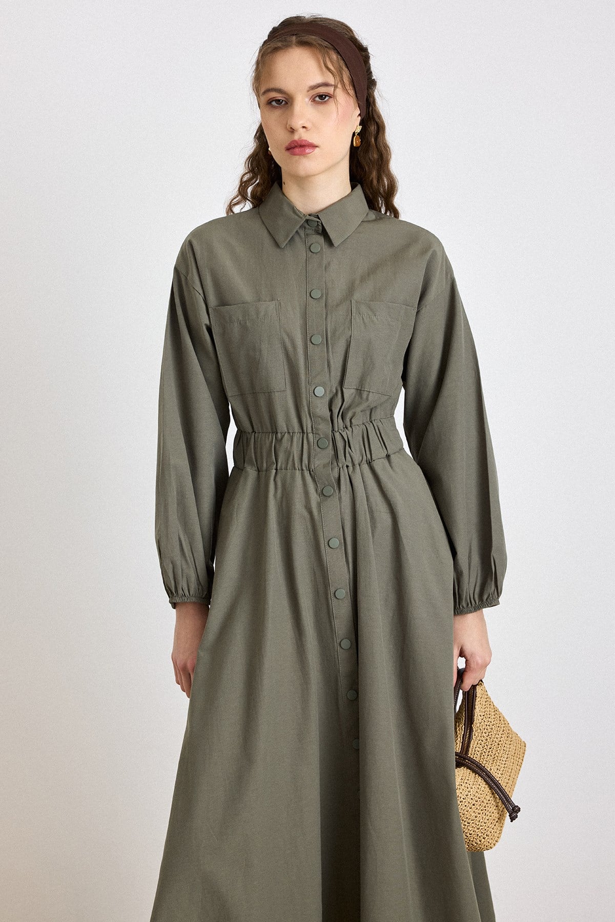 Khaki 9286-E Poplin Dress with Chest Pocket and Elastic Waist