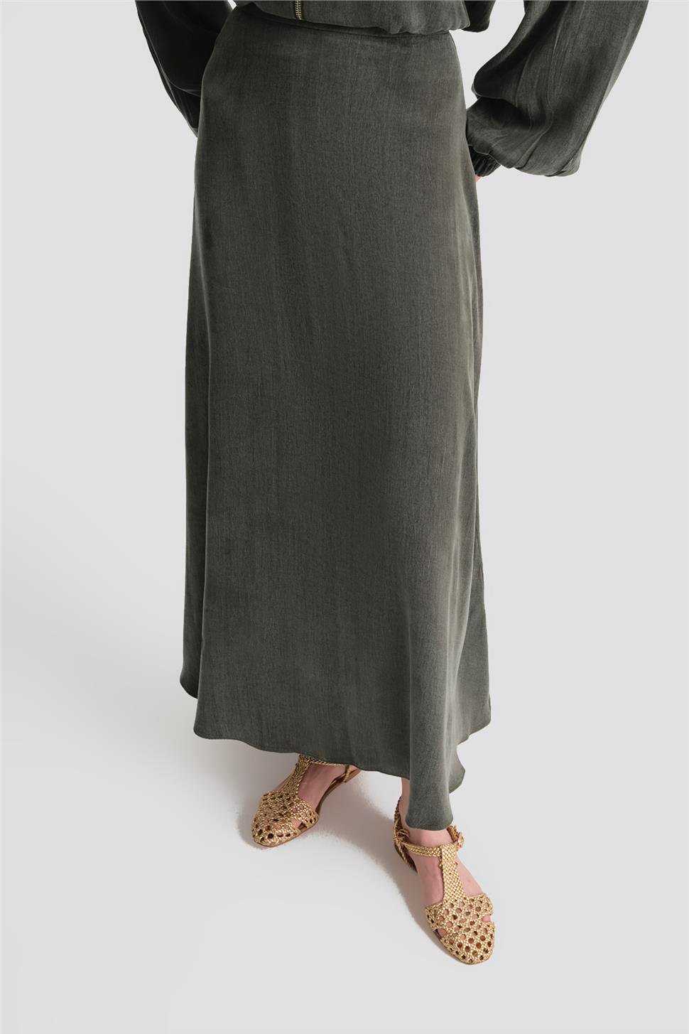This suit combines elegance with modern lines through its fluid form and soft texture, offering a sophisticated silhouette with a balanced stance. The adjustable cropped jacket subtly highlights body proportions, while the long skirt design creates a seamless, flowing look. A timeless design for those seeking effortless elegance, from daily chic to more refined combinations.