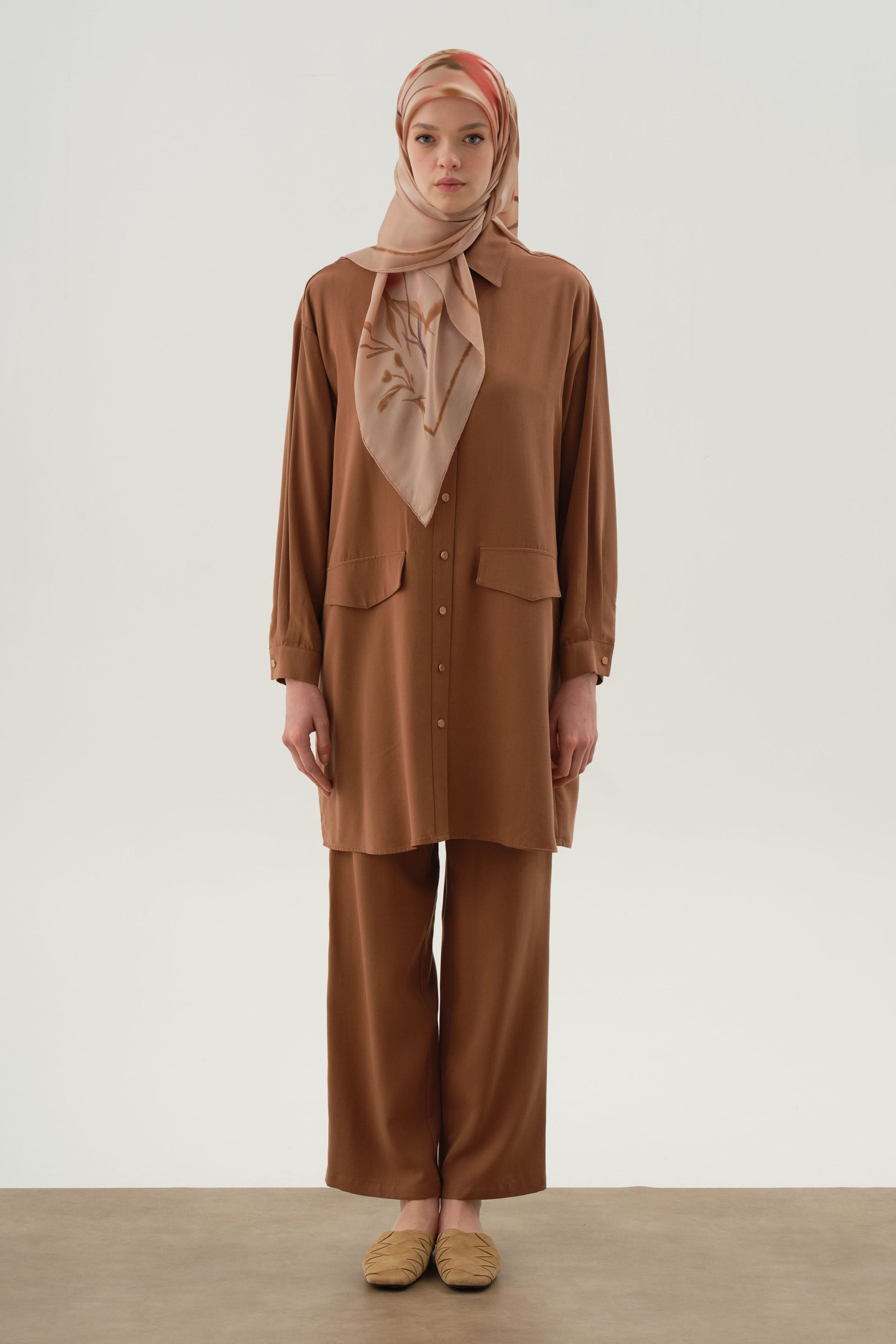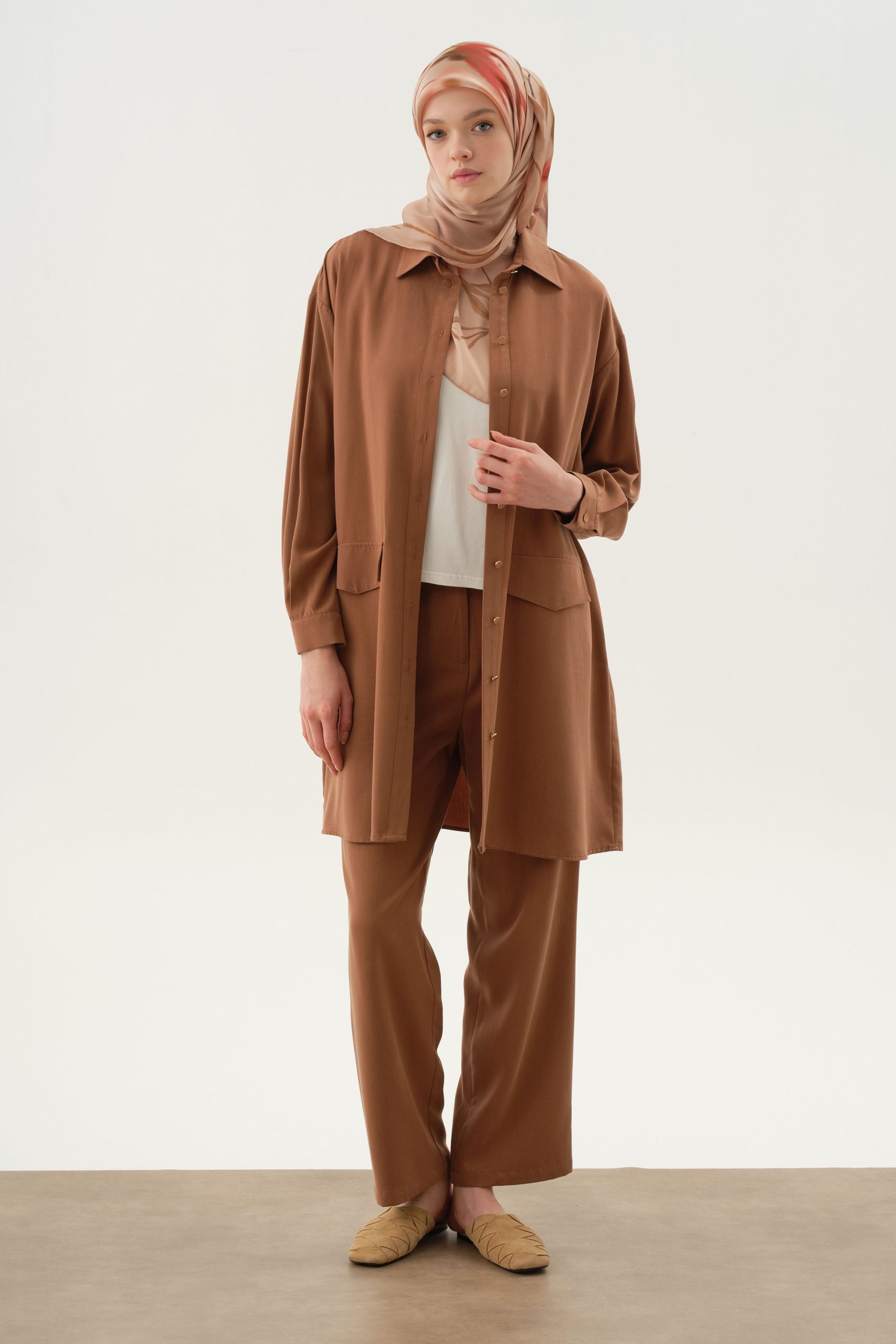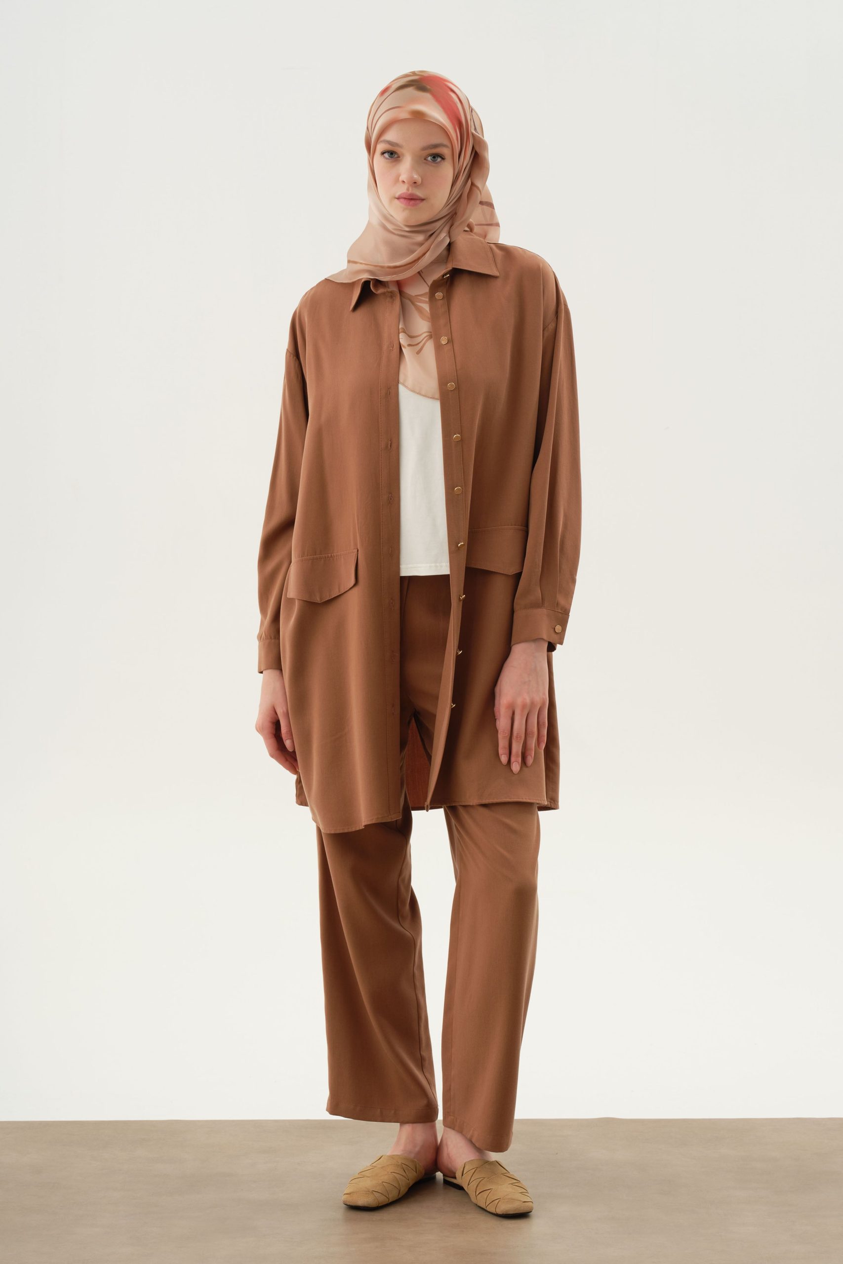 Featuring a soft-textured knitted blouse and a simple long tunic, this set is the ideal reflection of comfortable elegance. Its harmonious design offers an effortlessly chic look. Perfect for those who want to be both comfortable and stylish in everyday wear.