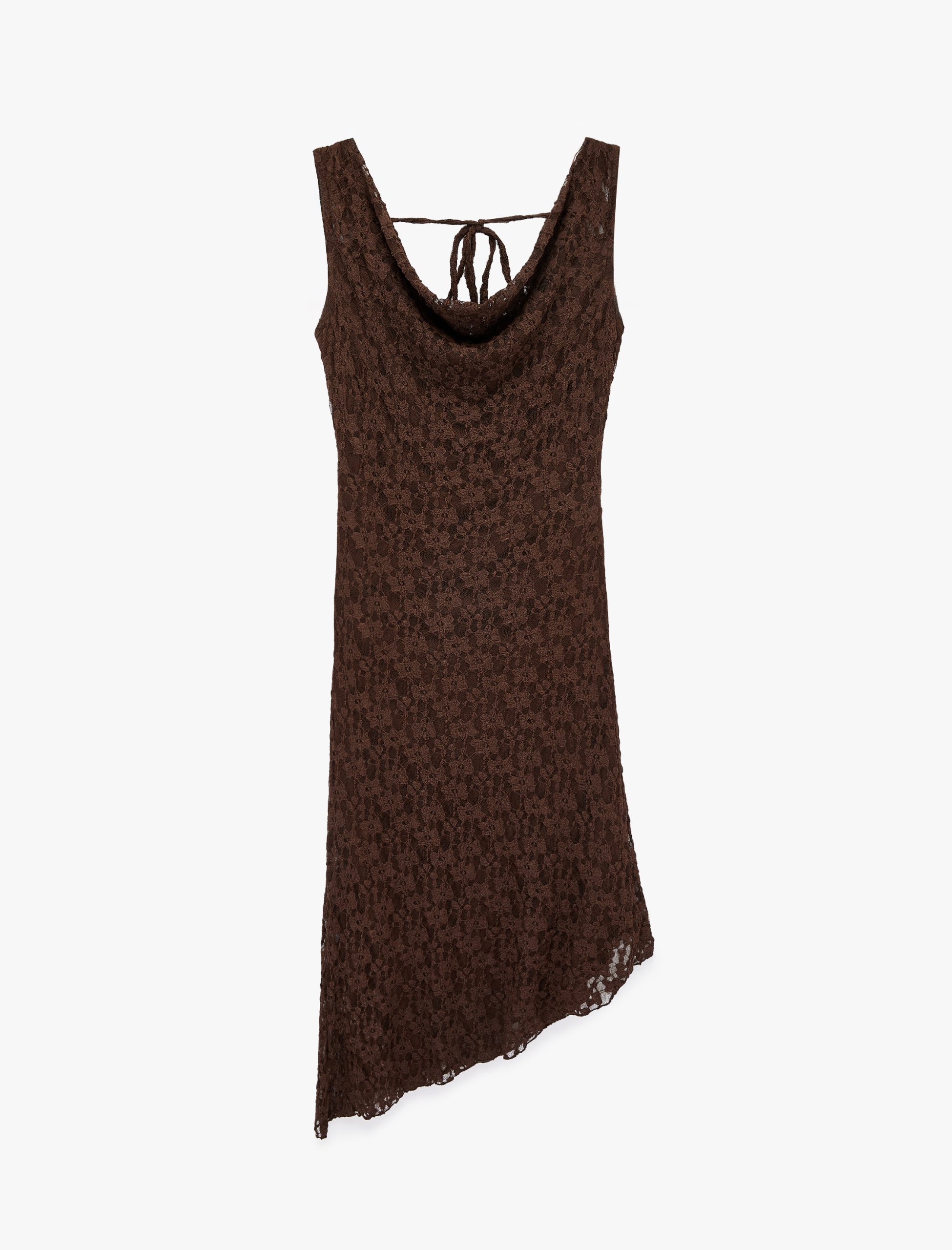 Kolsuz Degaje Yaka Asimetrik Midi Dantelli Elbise