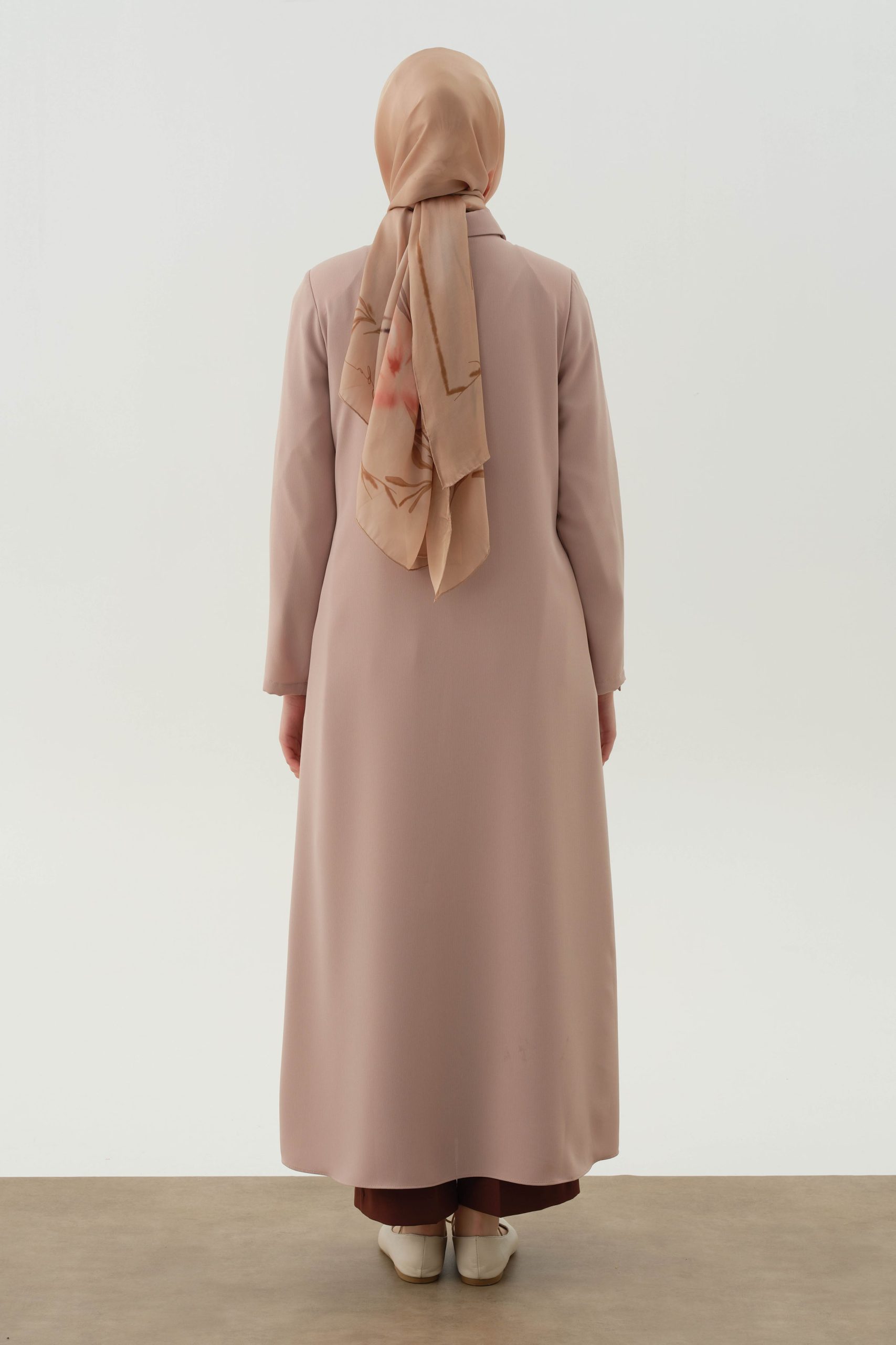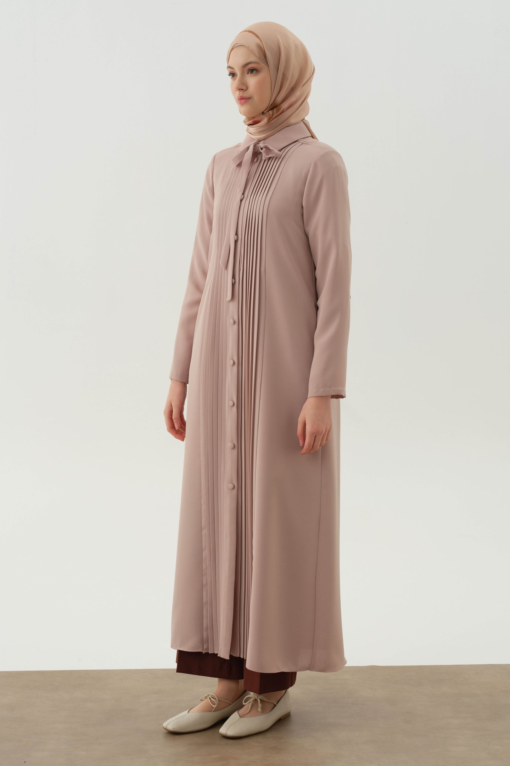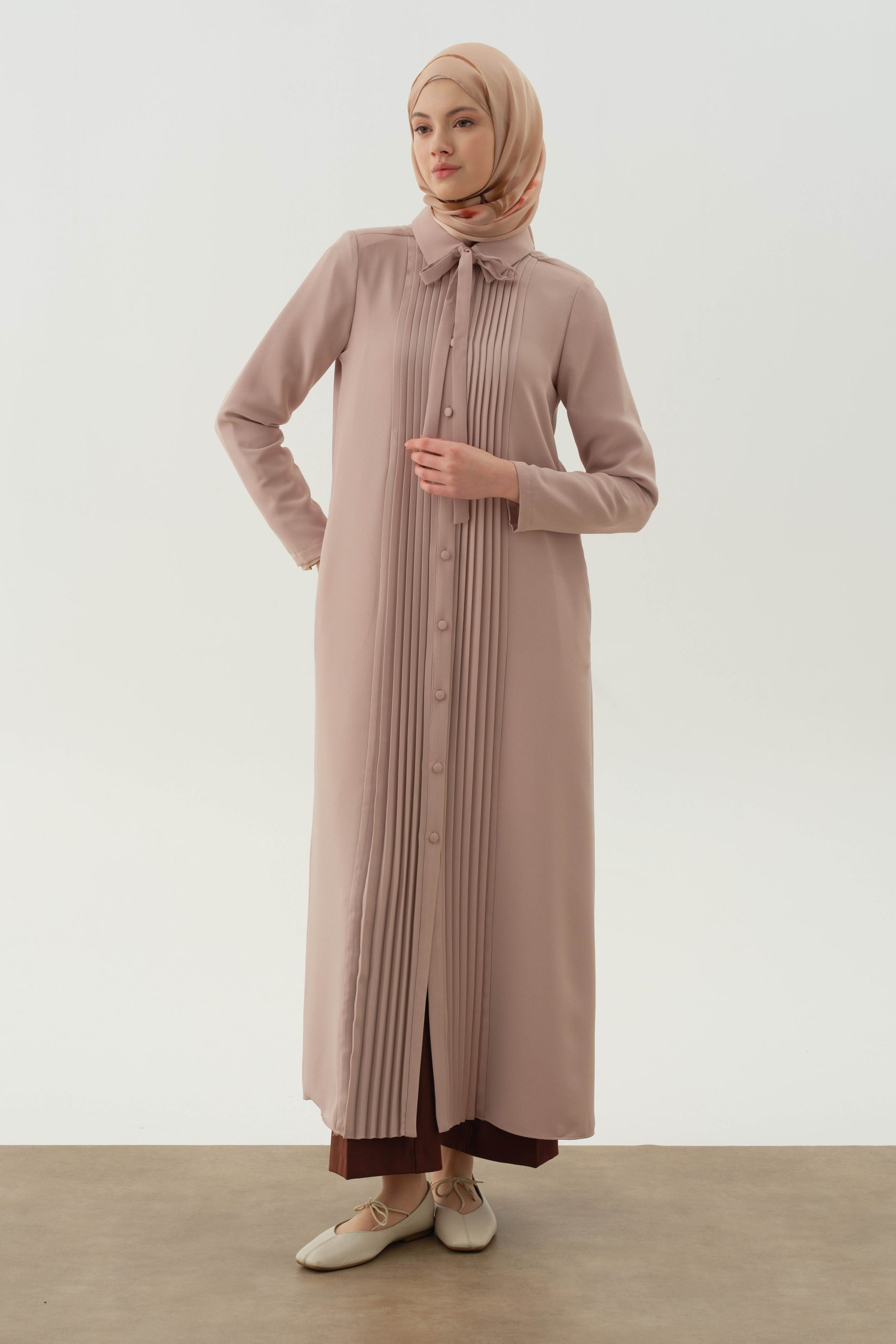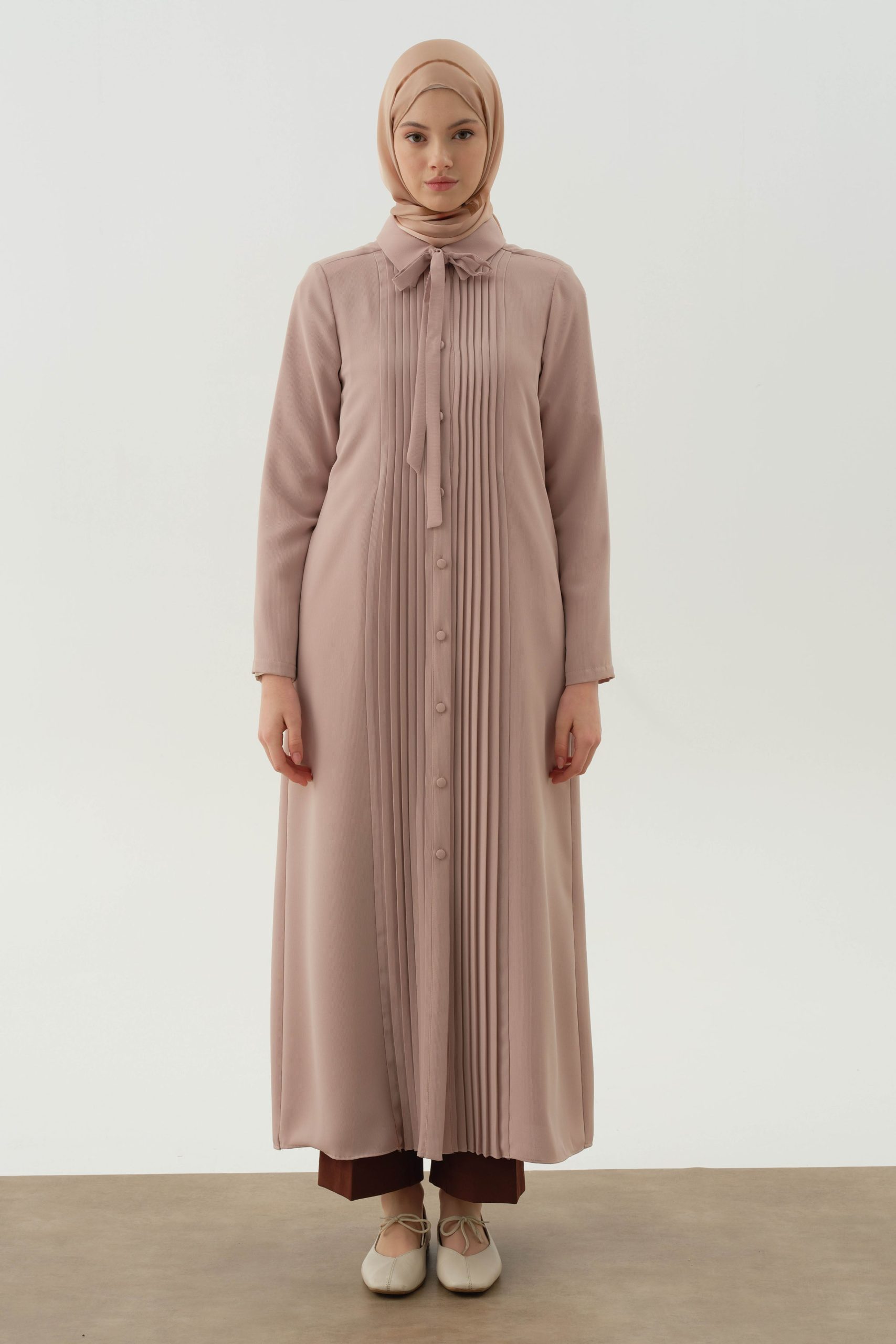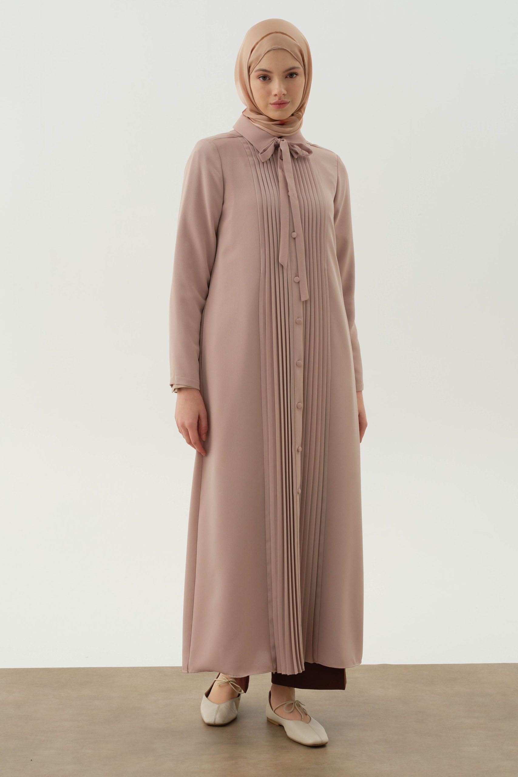 Zarif kravat yaka detayı ve etek kısmındaki piliseleriyle feminen bir duruş sergileyen bu pardesü, klasik şıklığı modern dokunuşlarla buluşturur. Akıcı yapısıyla her adımda zarafet sunar. Özel günlerden günlük kombinlere kadar geniş bir kullanım alanı sağlar.