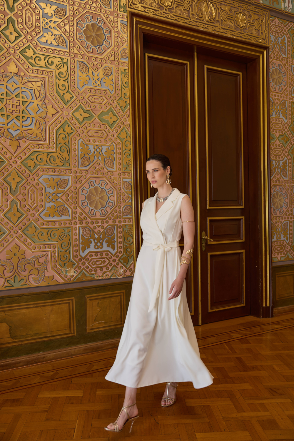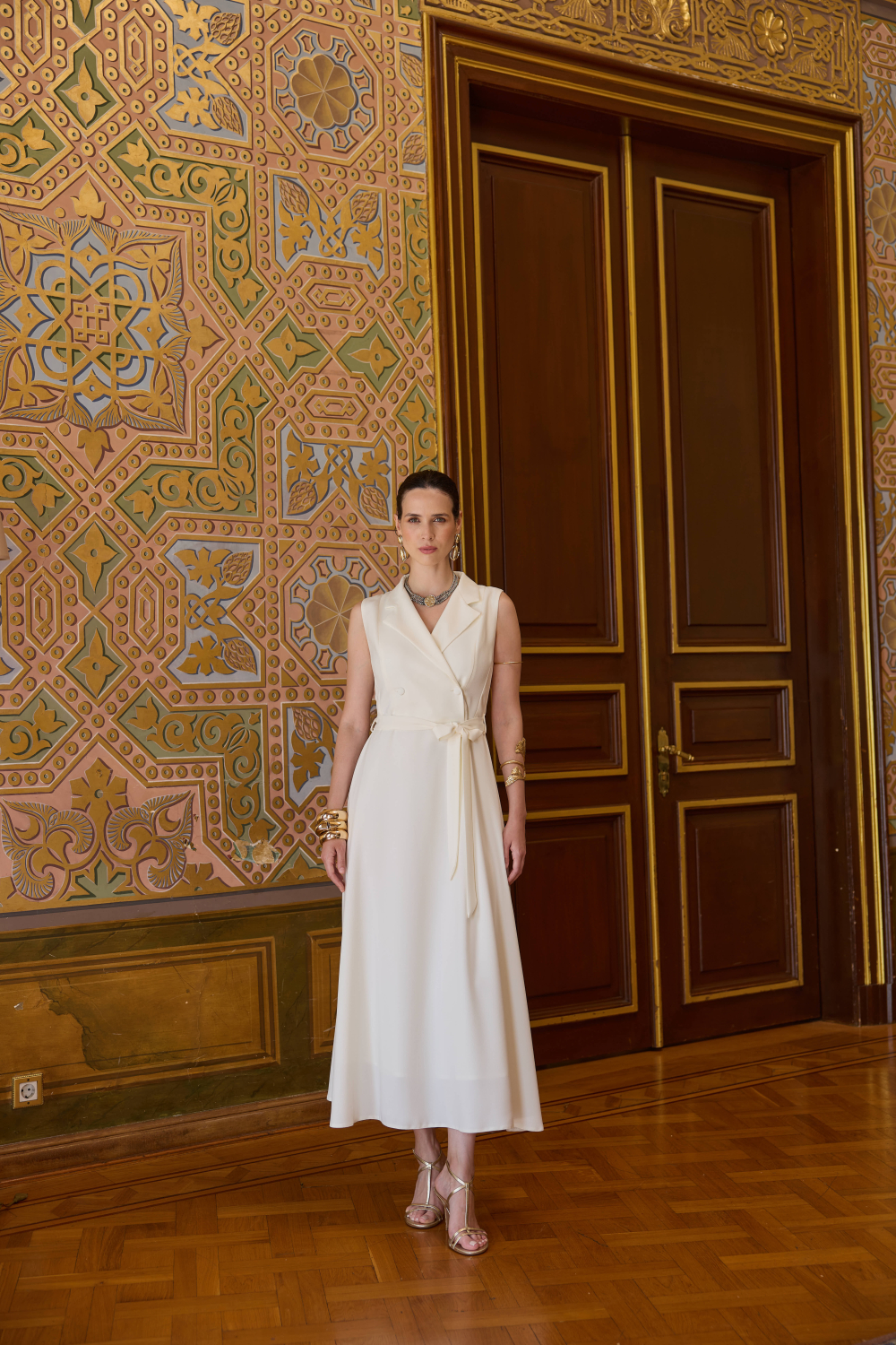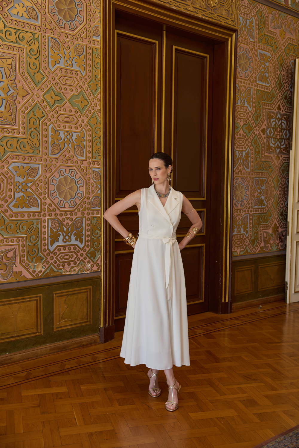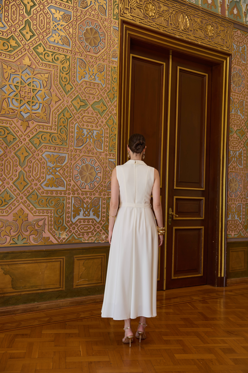 Ivory Asimetrik Yaka Detay Triko Elbise – Krem