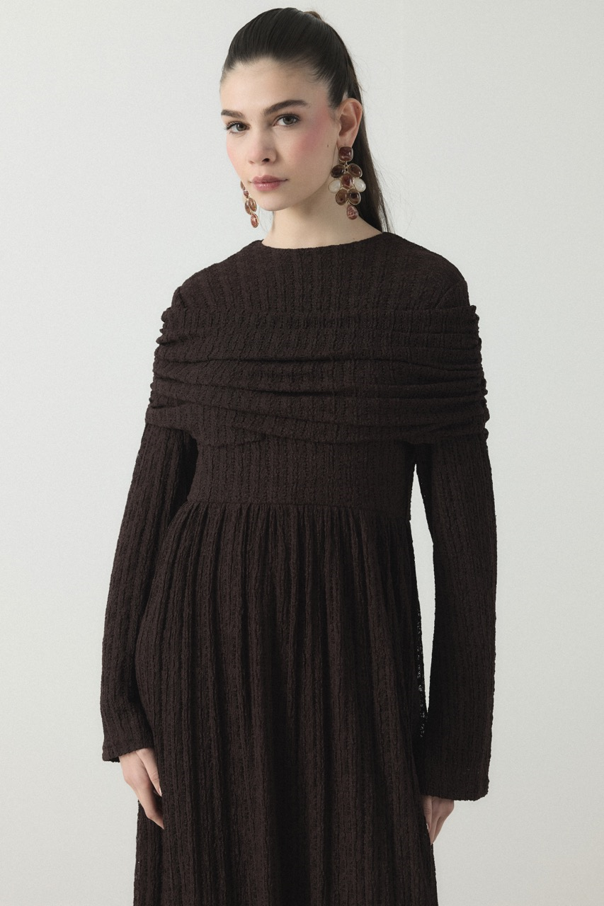 Boat Neck Crinkled Fabric Long Sleeve Dress