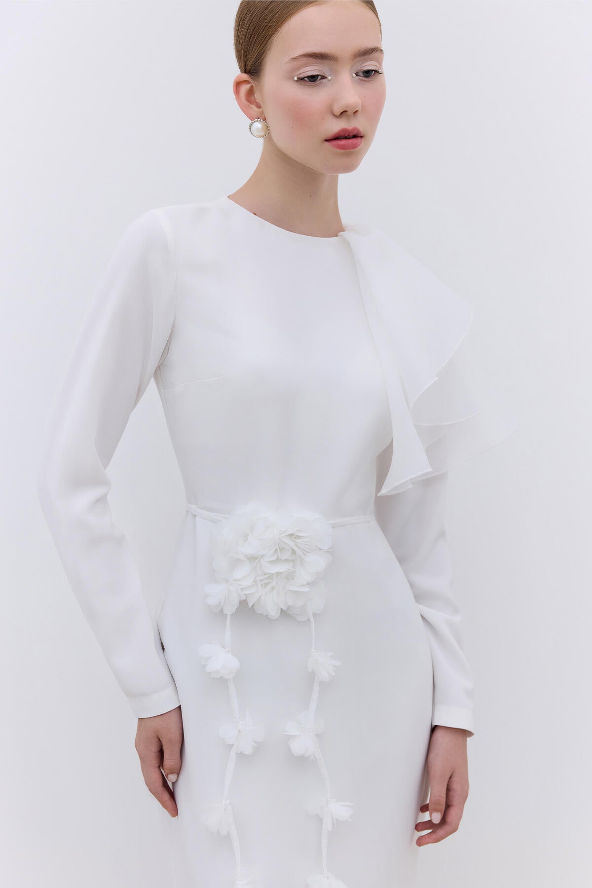 This elegant dress is designed with a body-conscious fit and features long sleeves with organza ruffle detailing on the shoulders. It is fully lined for added comfort and includes a hidden zip closure at the back.