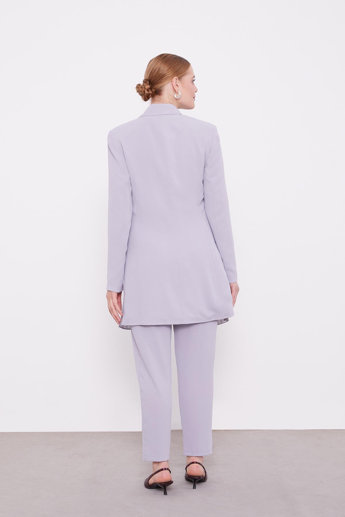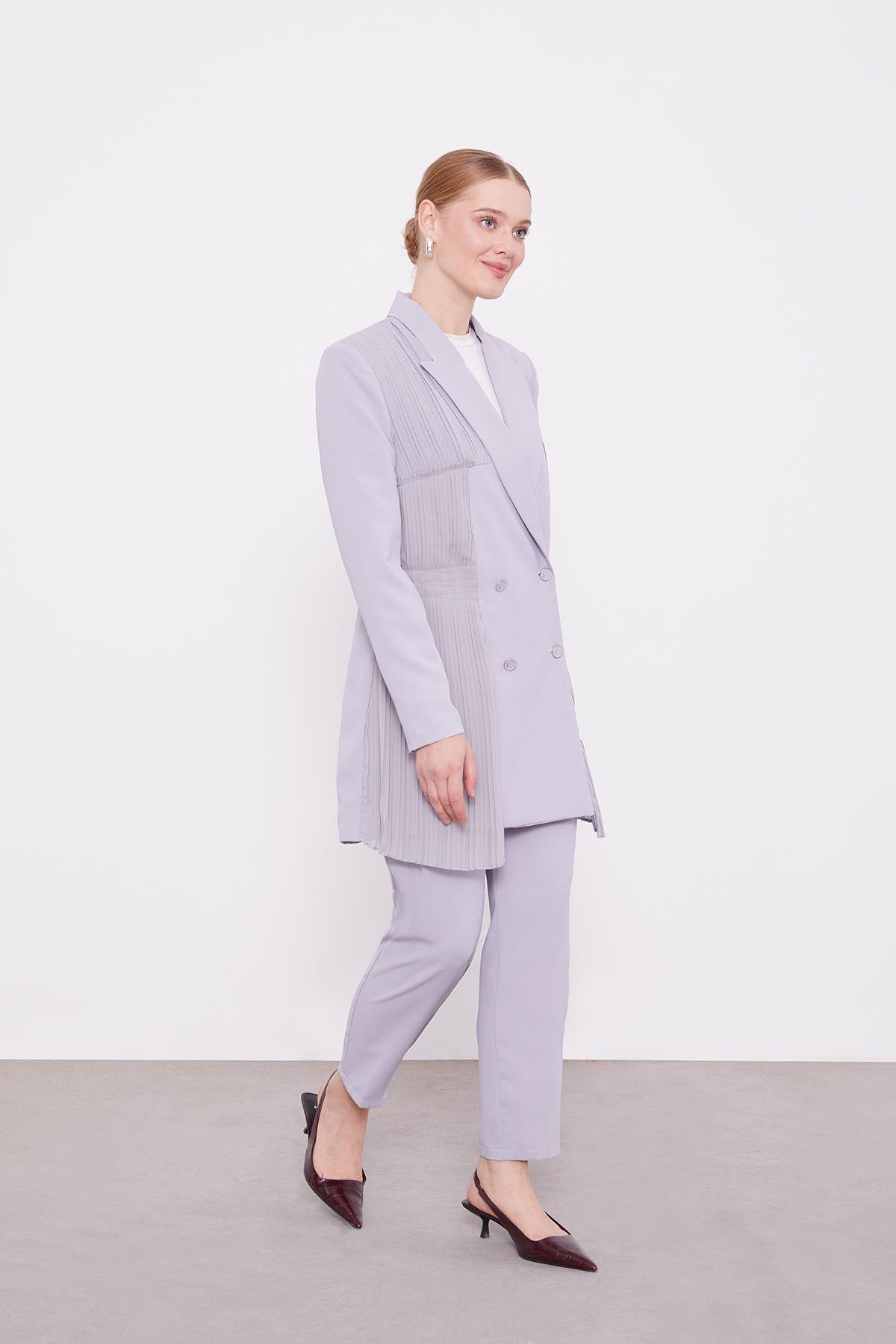 Among the season’s most admired trouser sets, this pleated chiffon jacket set has become a favorite for women who value style. The chiffon pleat details offer a romantic look while creating a modern and energetic style. You can create different combinations by wearing the set pieces separately. For women seeking a stylish appearance, it impresses with a sophisticated look for both daily wear and special occasions. When paired with ready-made shawl models, it provides all-day comfort while maintaining its shape with its wrinkle-resistant structure.