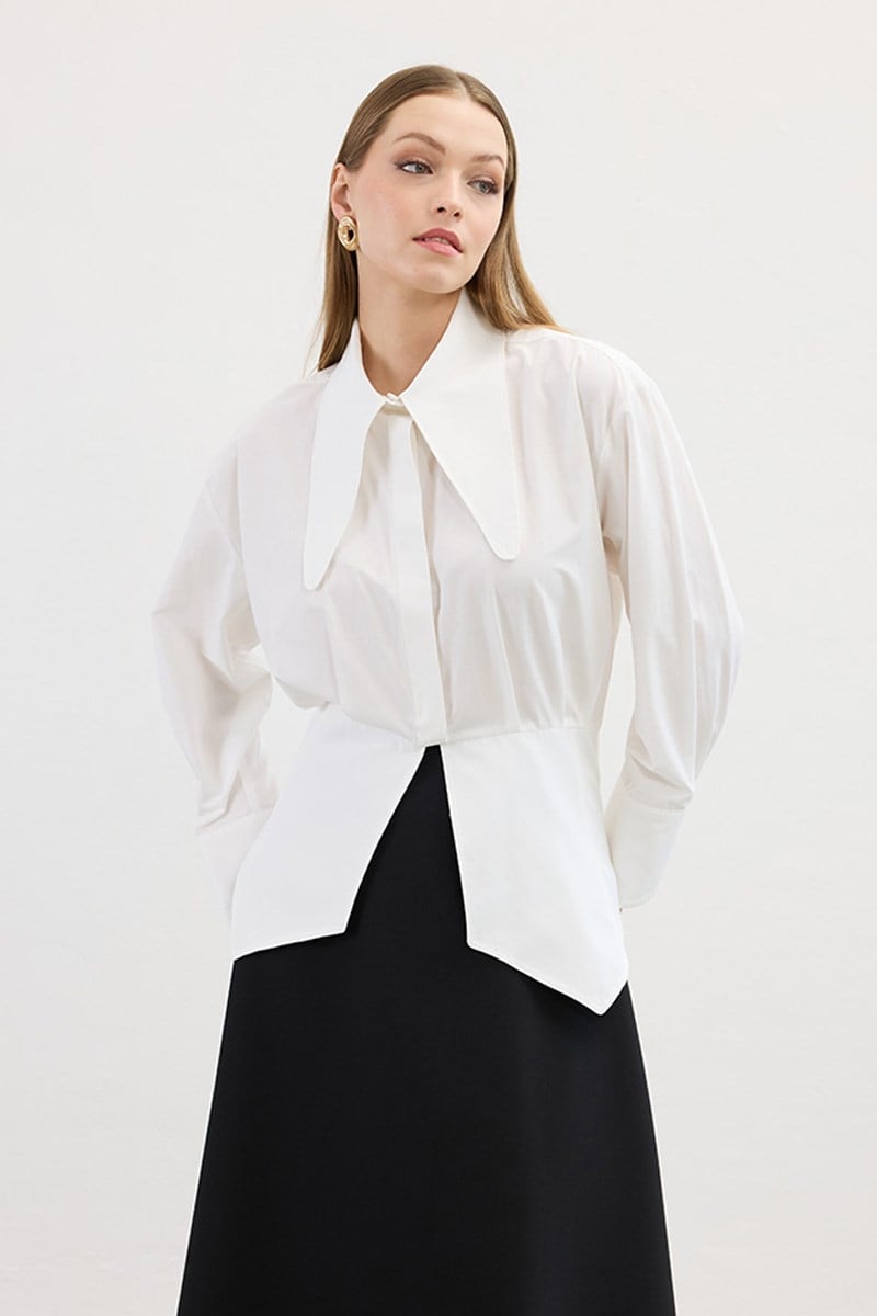 Tags: cotton blend, ecru shirt, long collar, summer wear, women's fashion