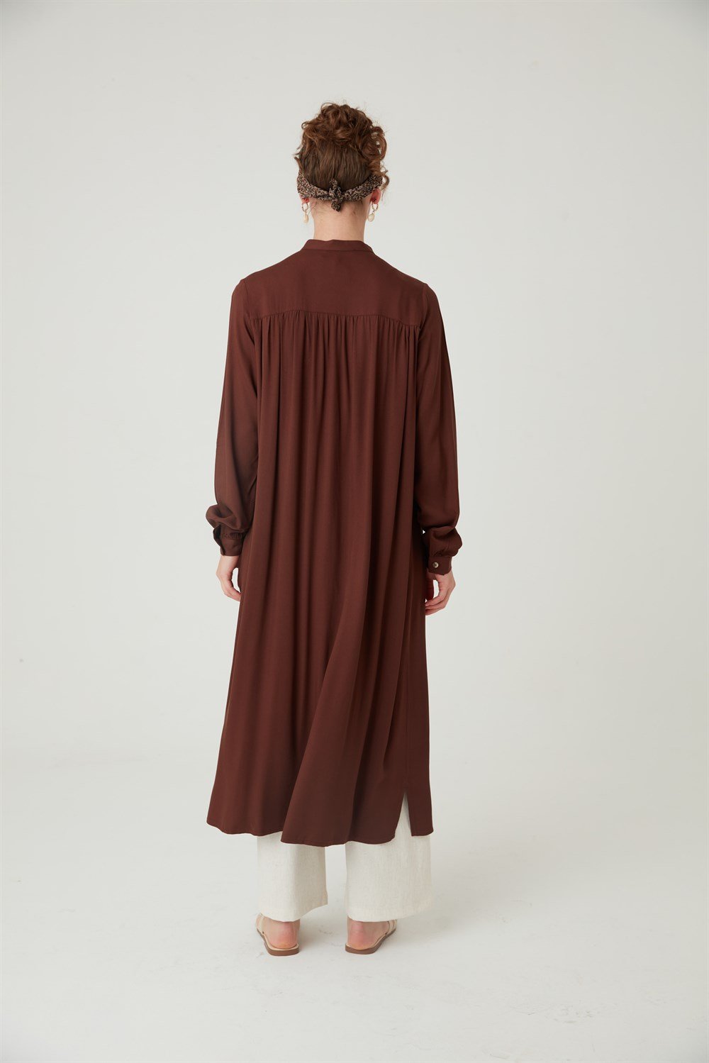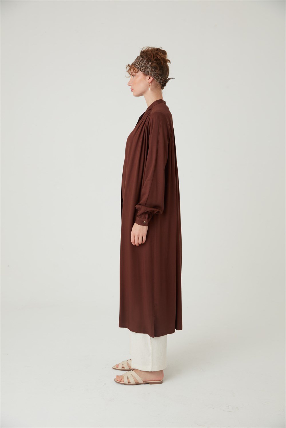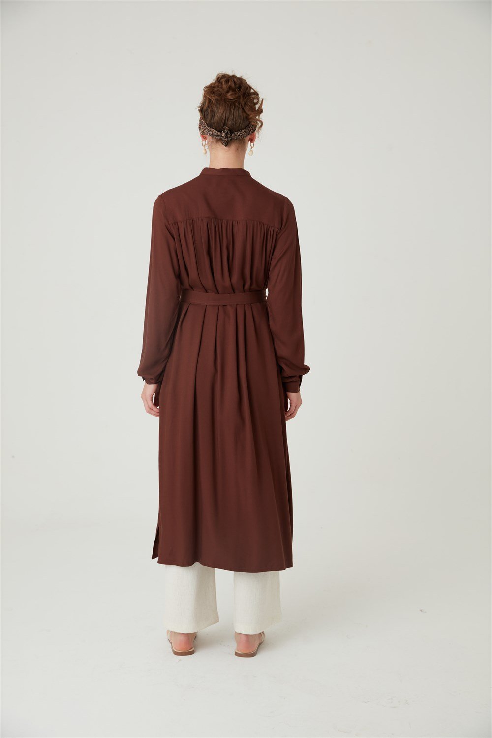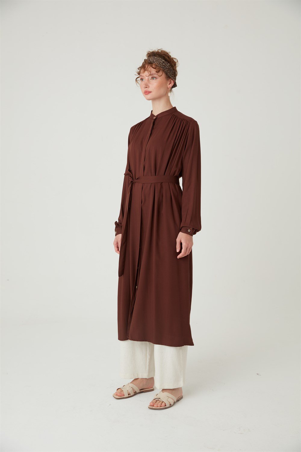 Tags: belted tunic, bitter coffee color, long sleeve tunic, loose fit, pleated tunic, summer tunic, viscose tunic, women's fashion