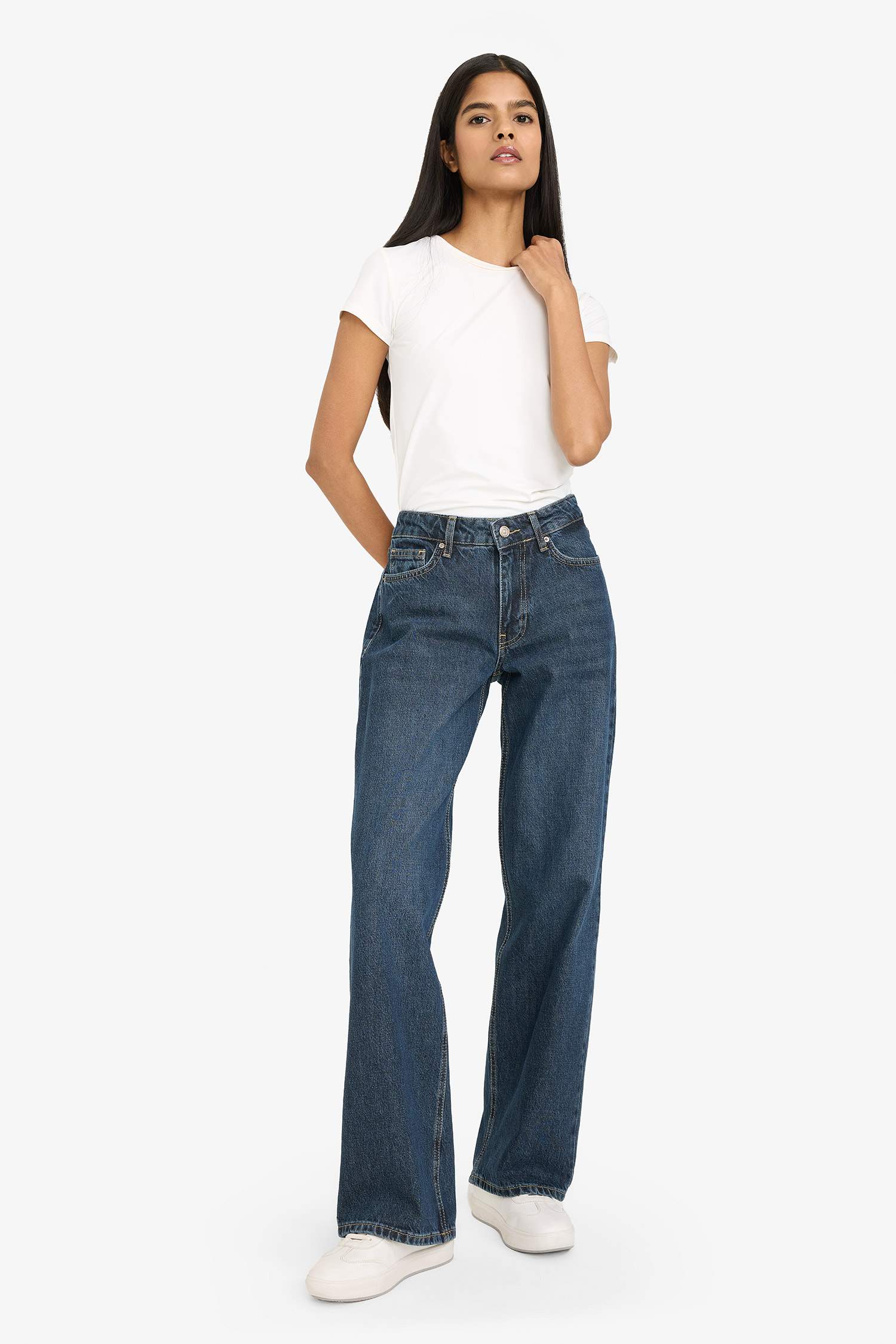 Low-rise long jeans with a washed finish, featuring a modern cut and a stylish washed appearance. The long leg design enhances leg length while providing comfortable wear. Easily complements both casual and urban styles.