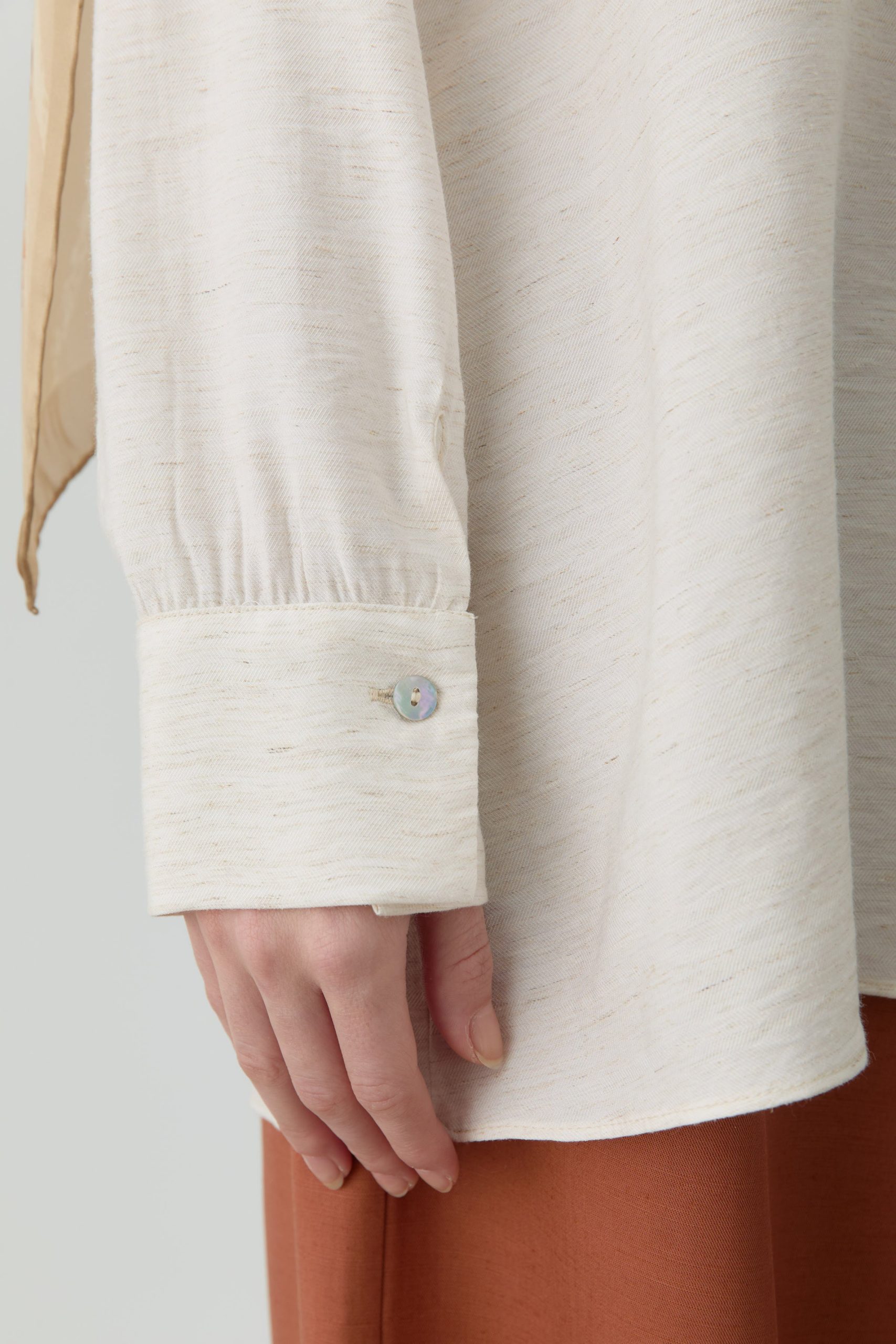 This shirt offers a modern and simple look with its mandarin collar design, enhanced by elegant cuff details.