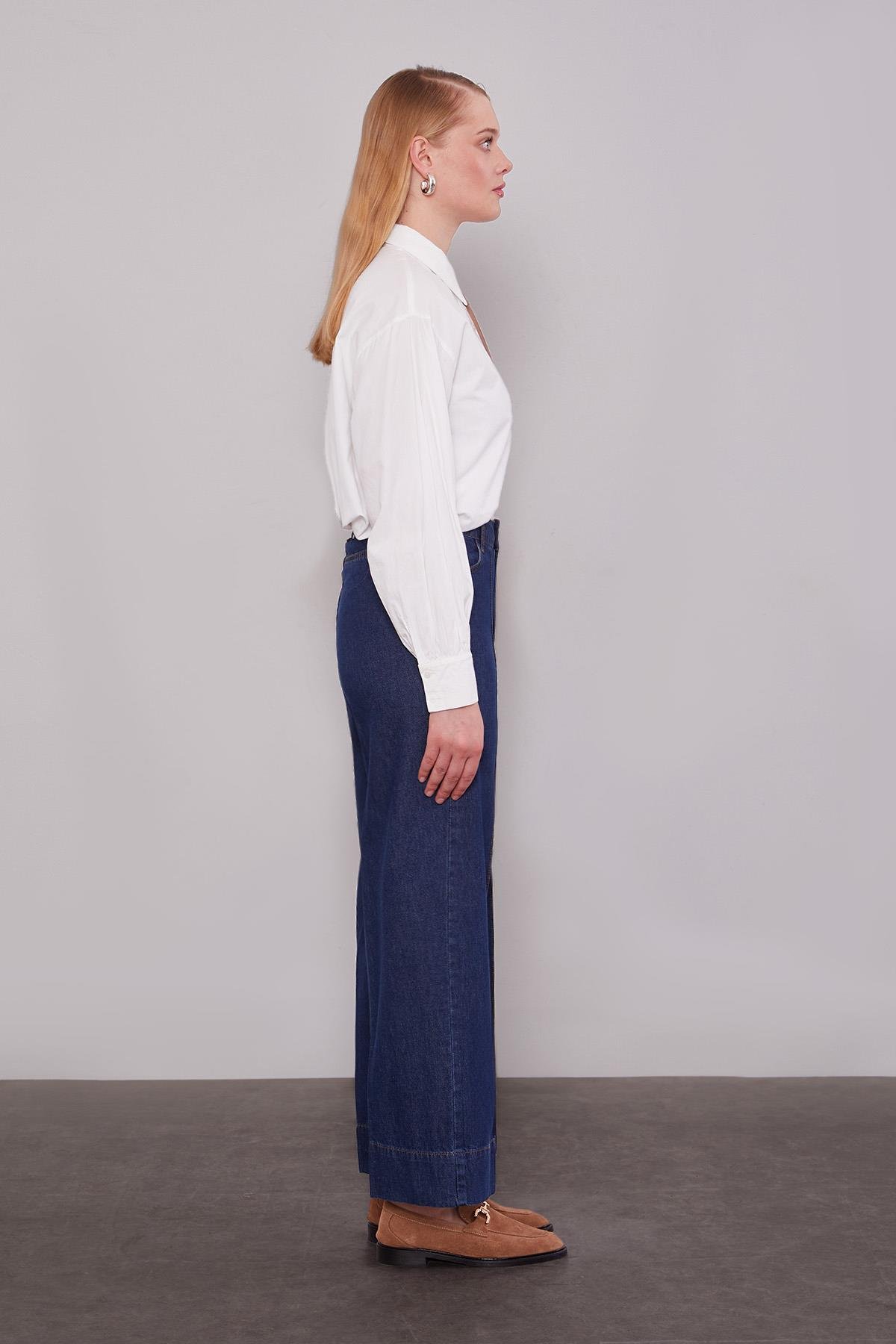 Wide-leg jeans with hem stitching detail combine comfort and elegance with a perfectly fitted silhouette. Thanks to the wide-leg design and stitching detail of our pants, you can achieve elegant sophistication with heels or create a casual style with sneakers. You can add a sophisticated look to your style by pairing them with long women’s tunics. With Levidor’s difference and guarantee, it’s now very easy to own stylish and high-quality models.