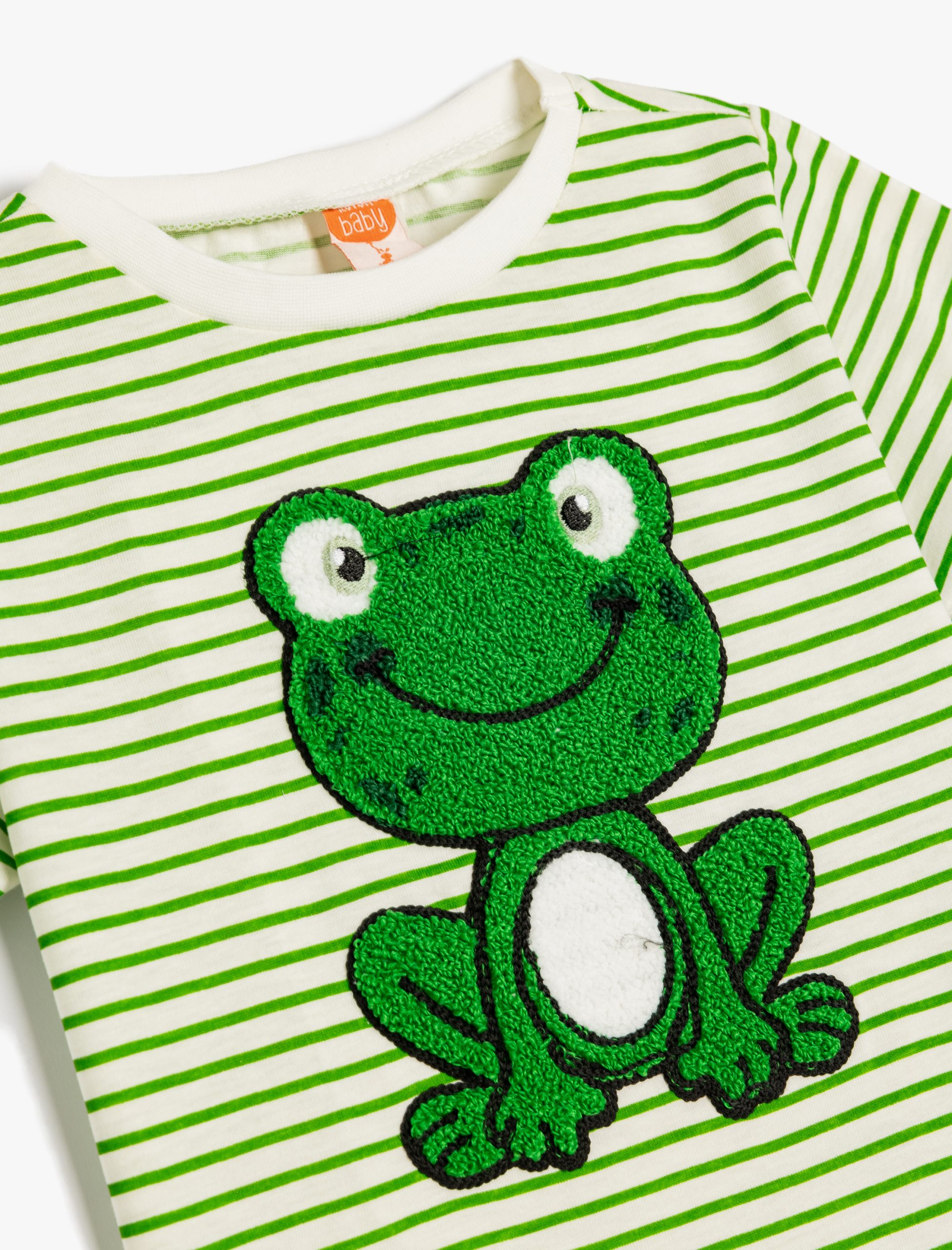 This frog-themed cotton t-shirt with adorable embroidery details is poised to become little ones’ favorite. The short-sleeve design offers comfort on warm days, while the crew neck detail ensures easy wearability. Perfect for active babies always on the move! Styling Suggestion Koton baby clothing models provide practical use with their comfortable structure and cute designs, creating lovely combinations. Product Features Sleeve Length: Short Sleeve Neck Type: Crew Neck Detail: Embroidered Fabric: 100% Cotton Usage Area: Daily Wear, Special Occasions Your baby is safe in this clothing! Our products are tested against chemicals and manufactured in compliance with all safety regulations. Our products do not contain health-hazardous dyes and heavy metals, small and sharp parts that could be dangerously swallowed, or cords and laces. Koton men’s baby t-shirt models successfully win parents’ approval. Offering both stylish and comfortable experiences, this t-shirt adds fun to little ones’ lives!