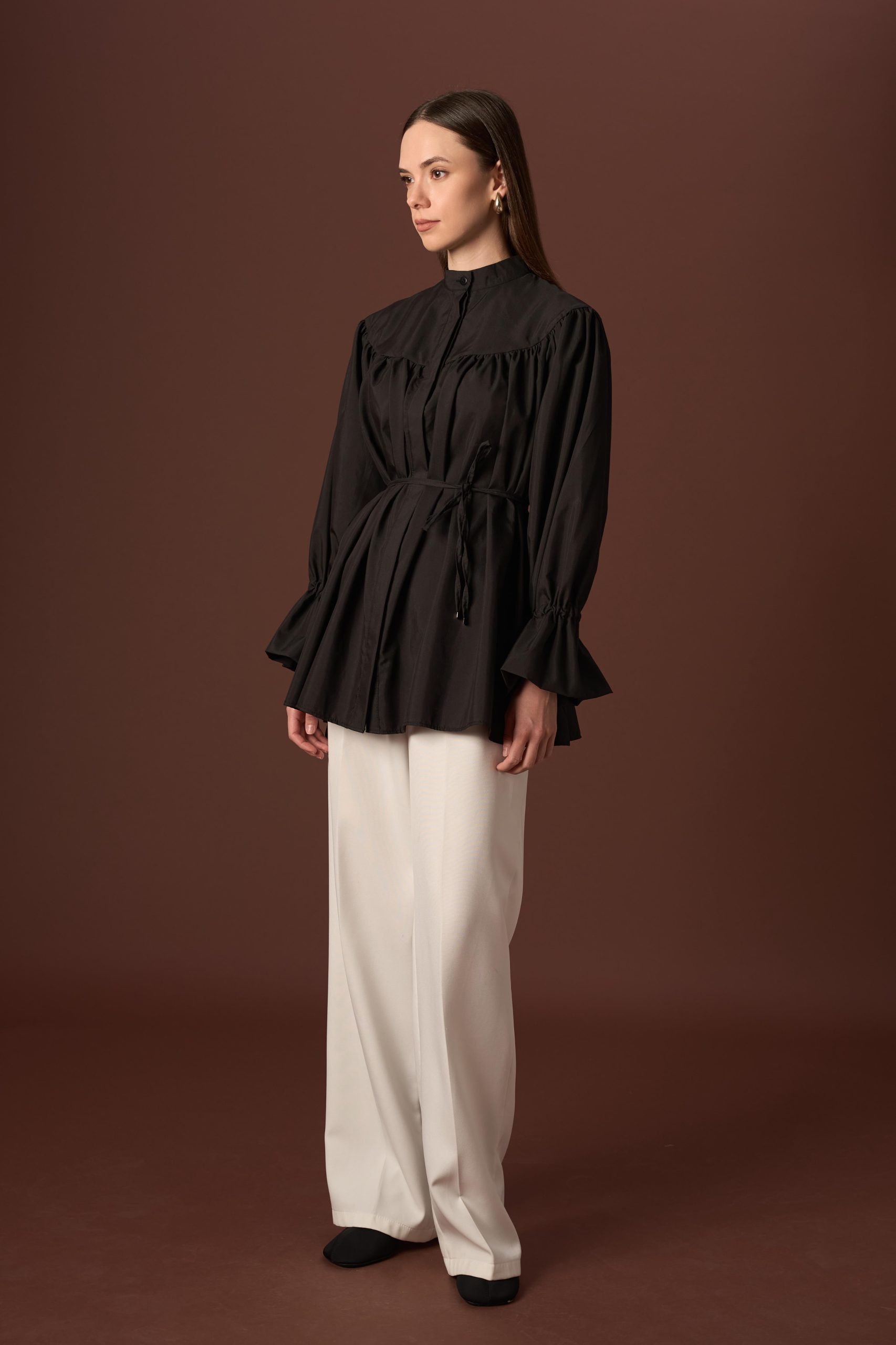 Beige Ruffled Collar Lace-Up Long Shirt