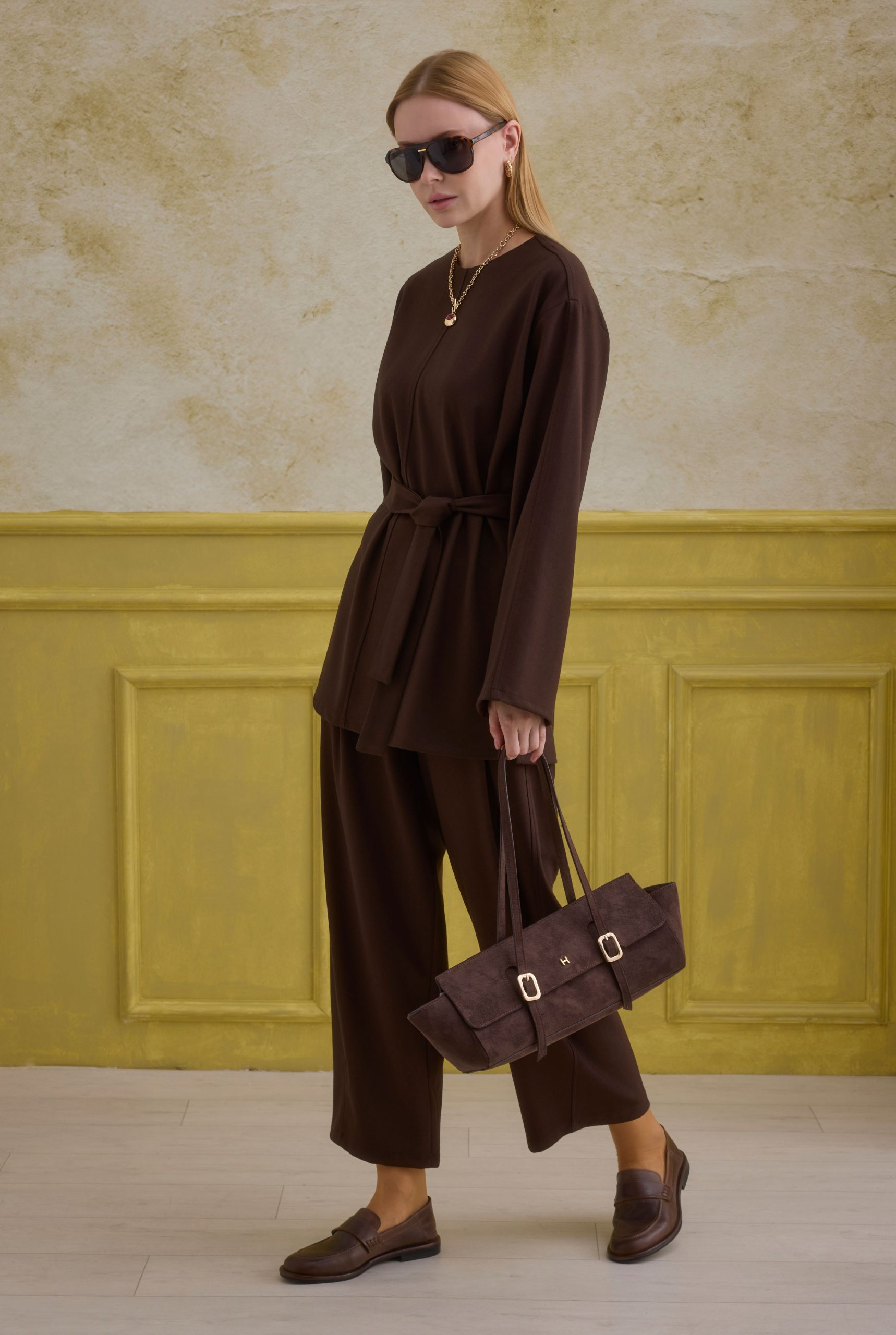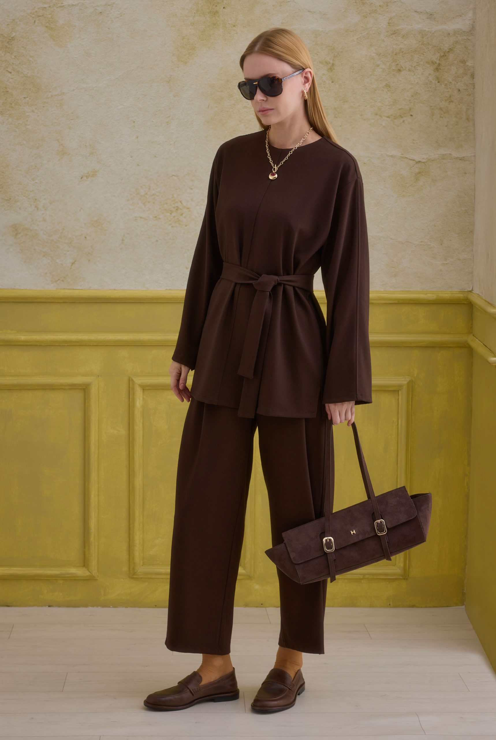 Crafted from a 63% polyester, 34% viscose, and 3% elastane blend, this set combines durability, fluidity, and comfort in a perfectly balanced structure. Polyester provides a firm texture and helps the fabric maintain its shape, while viscose adds a soft, breathable quality with an elegant drape. The elastane content enhances flexibility, allowing ease of movement and all-day comfort. Together, this blend ensures a refined yet comfortable wearing experience.