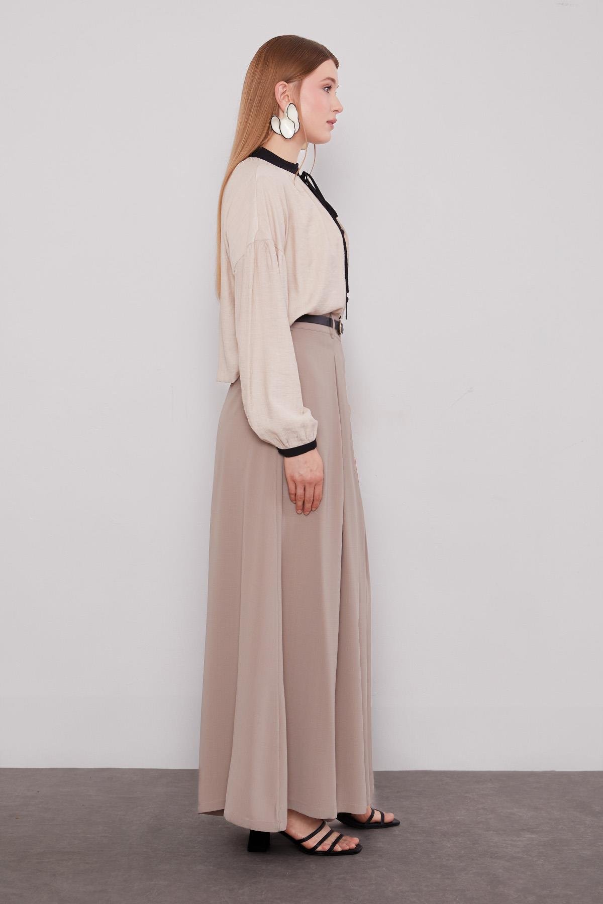 This wide-leg pleated pants skirt combines the comfort of trousers with the look of a skirt, creating a unique style thanks to its wide-leg design. The pleat details add movement and dynamism to the product, creating a sophisticated feel. The high-waist cut makes your legs appear longer and helps your outfits look more stylish. With its four-season usability, it’s an indispensable piece in any wardrobe. It offers versatile styling opportunities, easily pairing with both sneakers and heels.