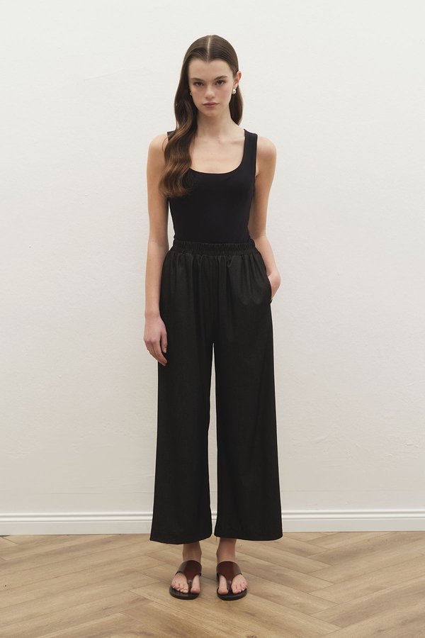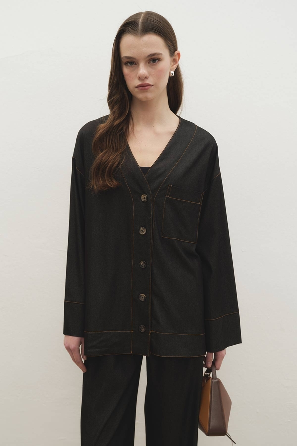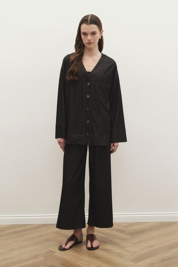 MİYAKİ TENSEL KOT PANTOLON SİYAH TAKIM ÖZELLİKLERİV yaka dikiş detaylı, punto dikişli, düğme kapama, yanlardan yırtmaçlı, önden cepli, rahat kalıp, yüksel bel pantolon, cepli, beli lastikli, astarsız pantolonlu takım.Kumaş İçeriği ve Yıkama Talimat:Maksimum 30 derecede yıkama yapınız. Düşük sıcaklıkta tersten ütüleyiniz.%65 Viskon %30 Pes %5 RyManken Ürün Bedeni: SManken Ölçüleri: Boy: 1.73 cm, Göğüs: 78 cm, Bel: 61 cm, Basen: 88 cm