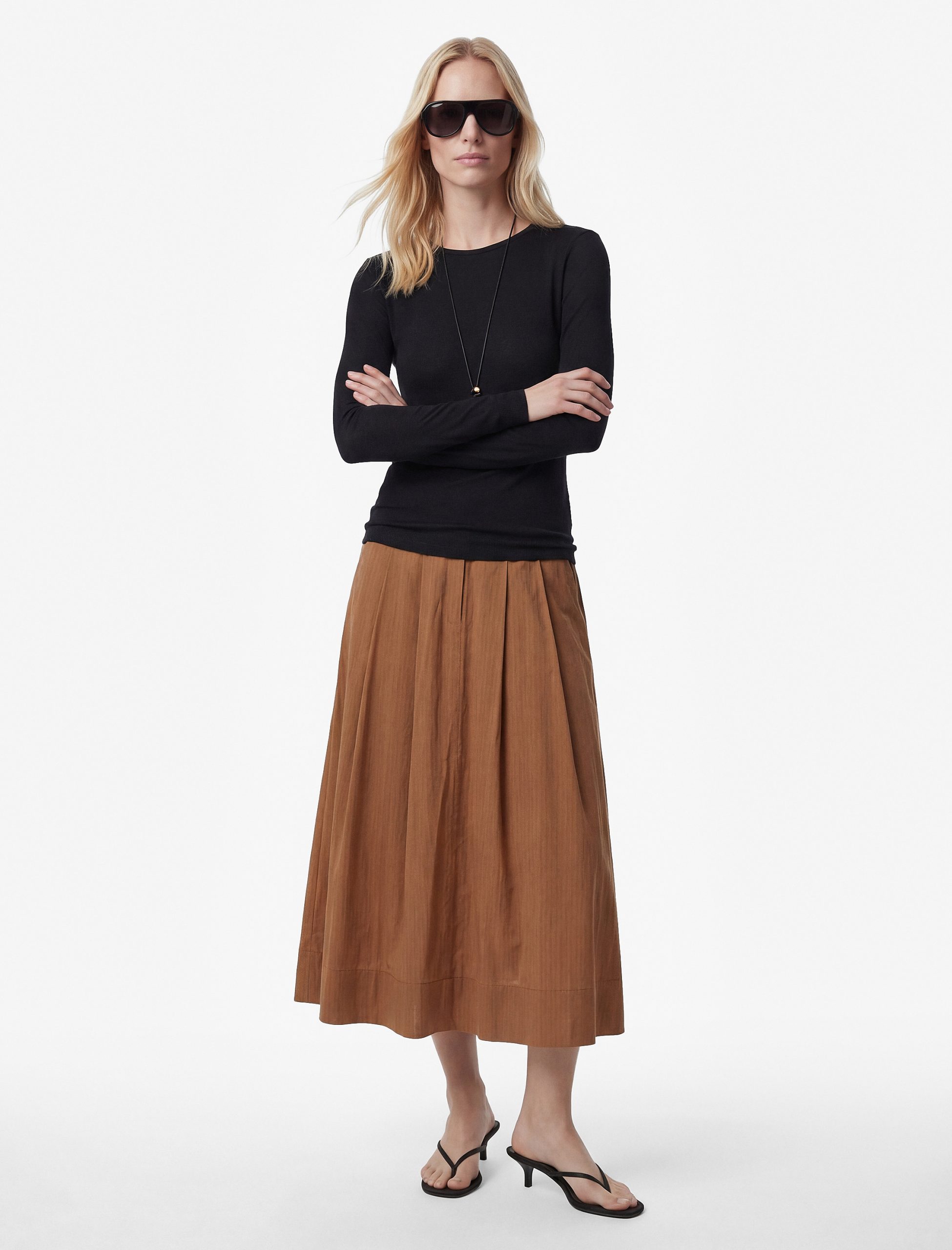Modal Fabric Pleated Striped Midi Flared Skirt with Pockets