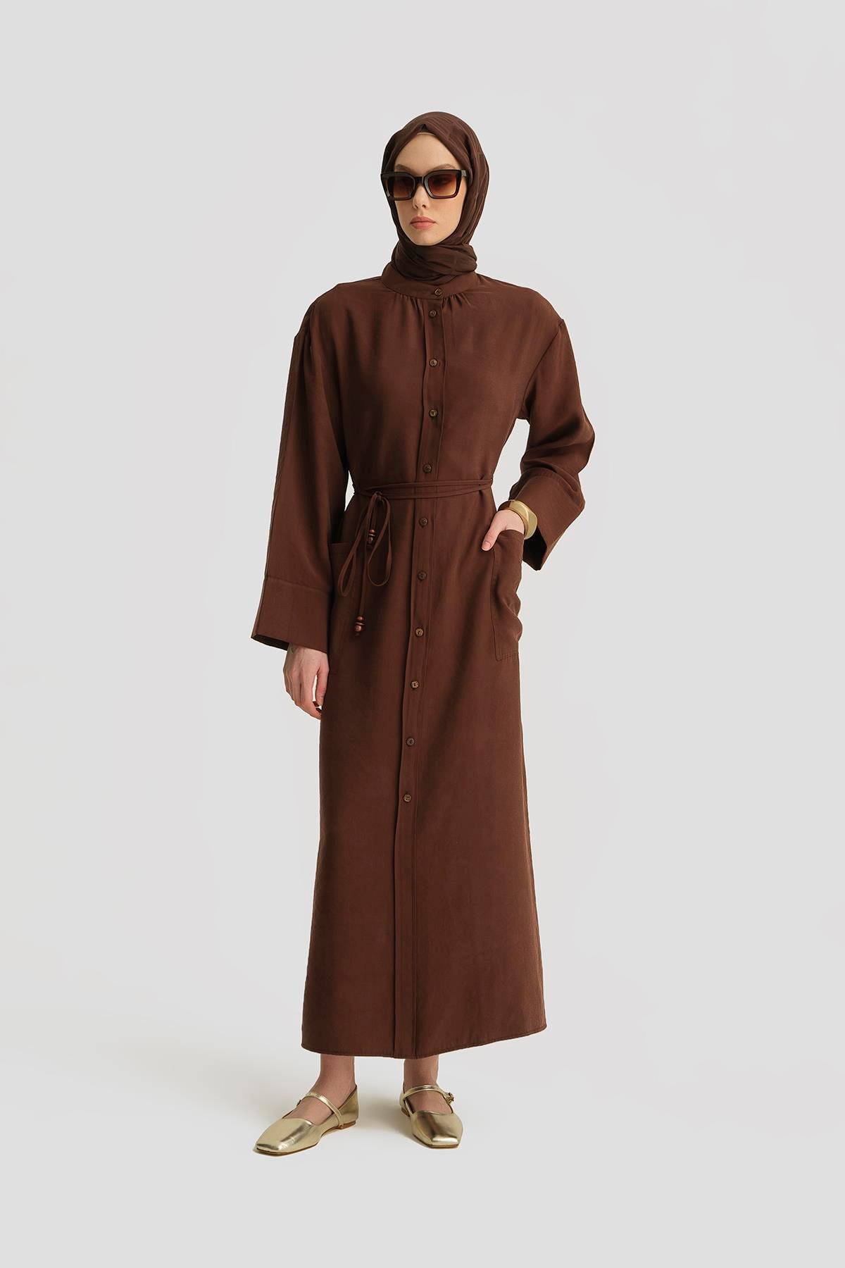 Tags: coffee color, flowing silhouette, minimalist fashion, modal dress, Tie-Waist, versatile wardrobe