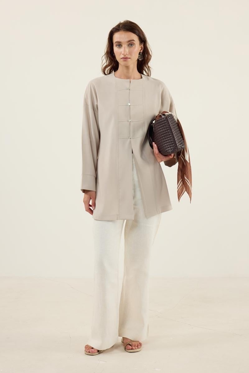 The Mother-of-Pearl Buttoned Modal Tunic Top is an essential piece for the summer season with its modern design and comfortable fit. Its fabric blend of 65% viscose, 28% nylon, and 7% lyocell offers a soft texture that provides lightness and breathability for all-day comfort. The boat neck and drop-shoulder design create a relaxed silhouette, while the slit details and mother-of-pearl buttons add an elegant touch to the tunic form.