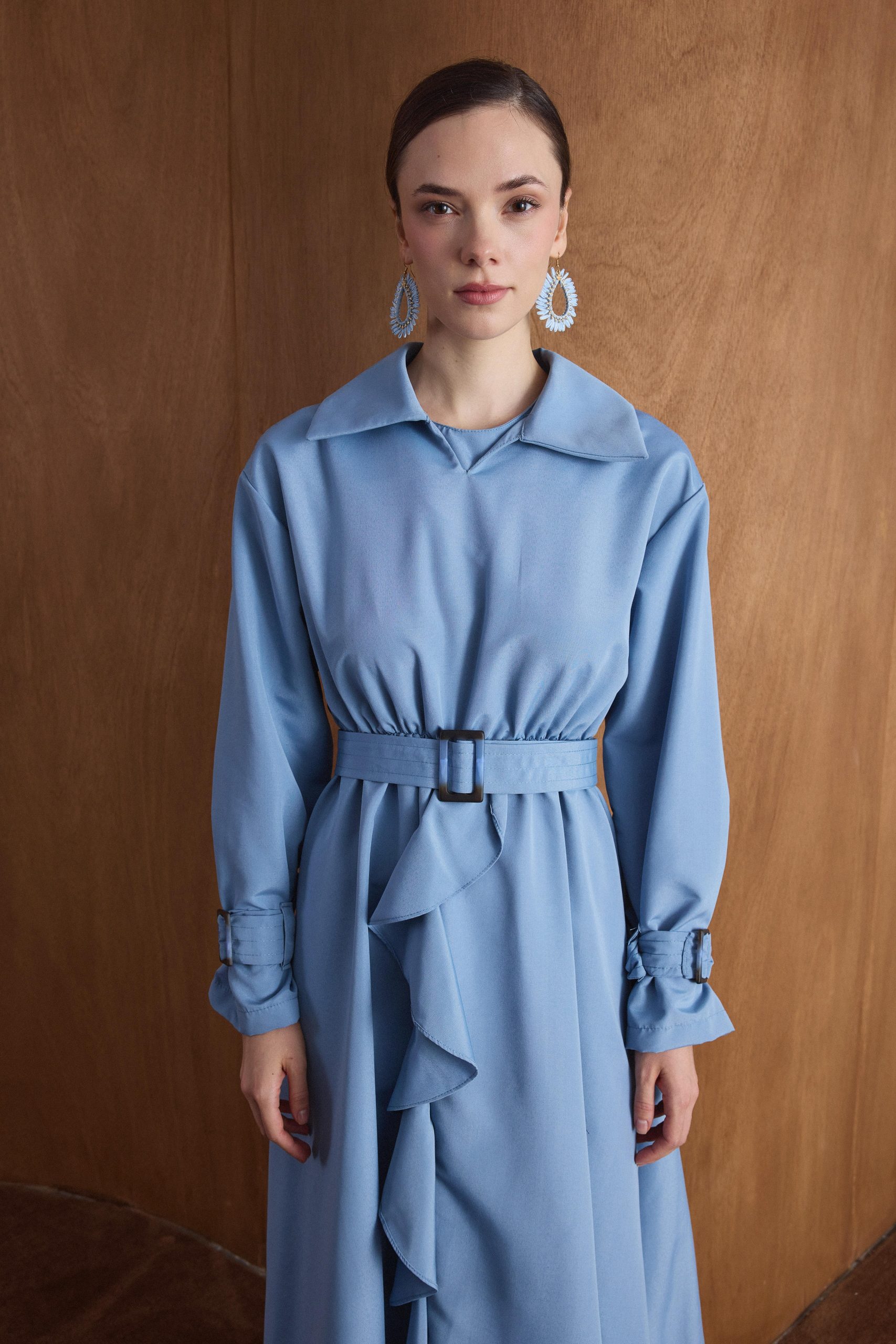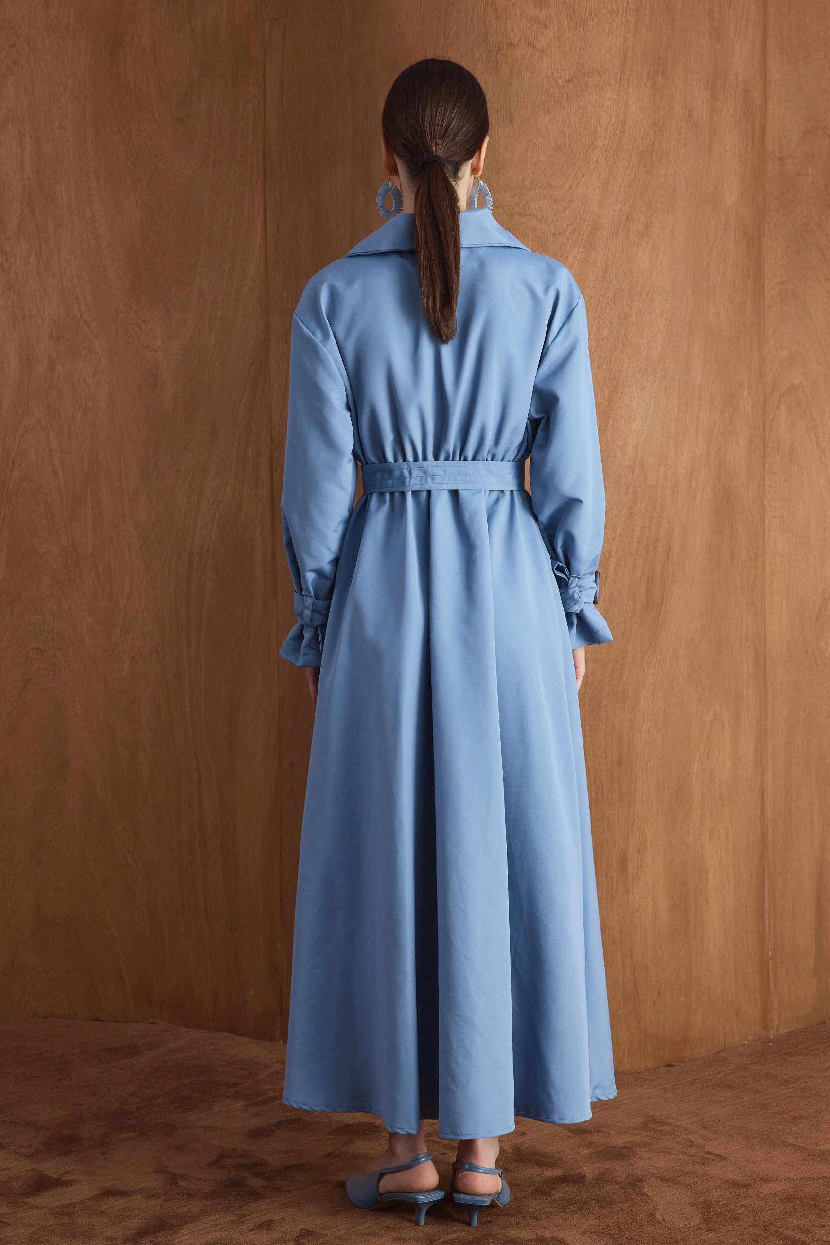 This maxi dress, with its elegant silhouette and modern details, showcases a perfect stance thanks to the sturdy yet fluid structure of trench fabric. The pleated detail on the front adds movement to the design, while the belted waistline gracefully accentuates body contours. With its long length and clean cut, it offers a chic alternative for both special occasions and urban style.