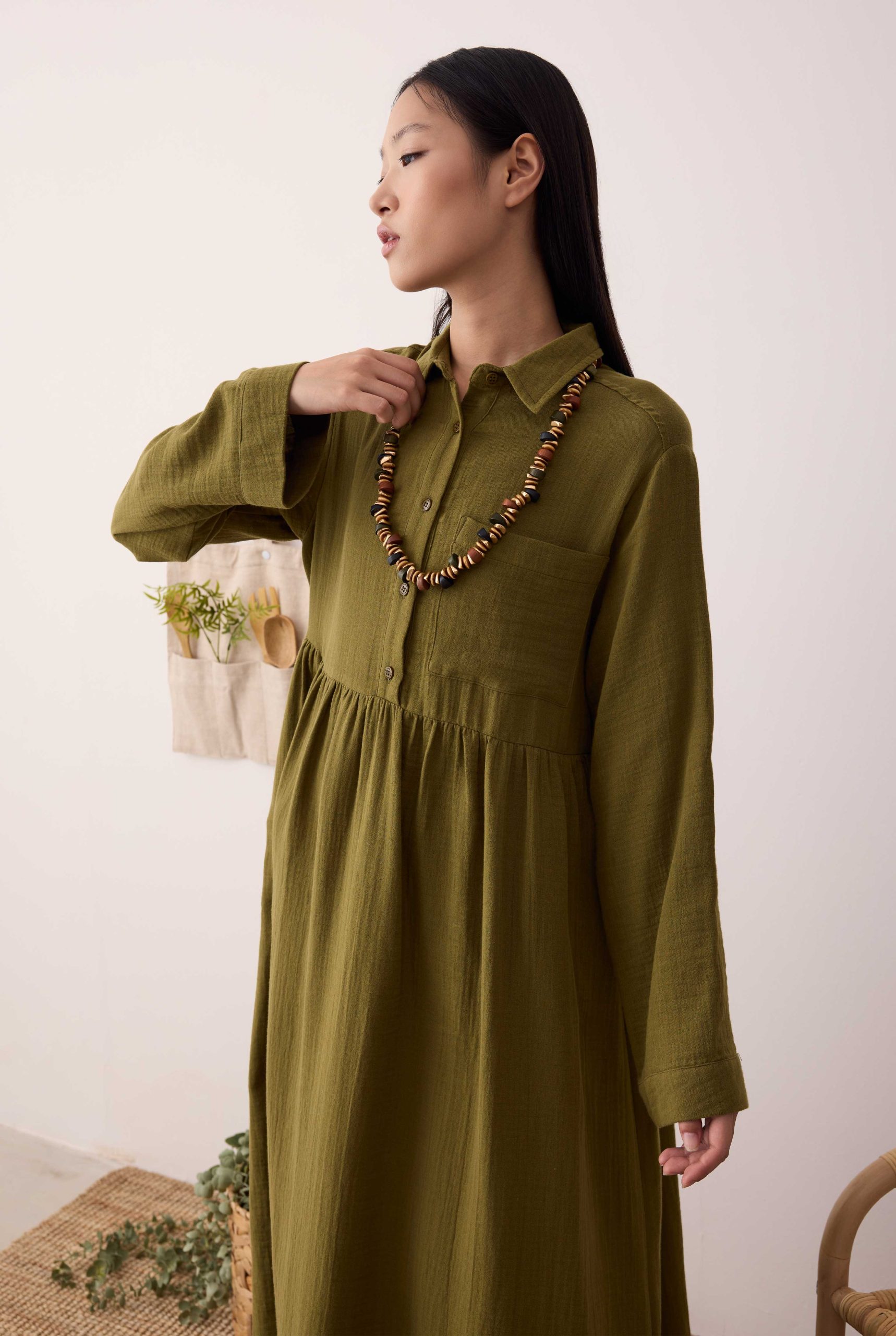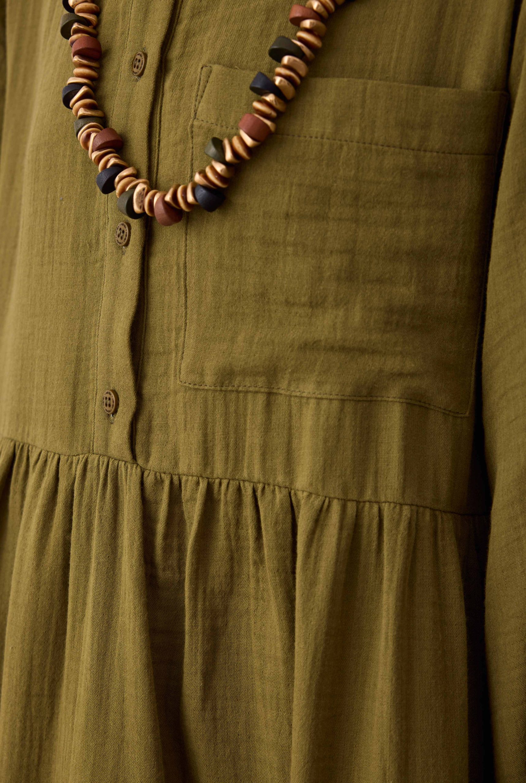 Our dresses crafted from 100% cotton muslin fabric offer timeless design and breathable texture for comfort even on the hottest days. The lightest colors remain discreet when worn with a skin-toned camisole. Our specially prepared muslin fabrics in colors matching 2025 Pantone palettes can be used for years like new when washed delicately at 30°C. The product has a loose fit; if you prefer a less voluminous look than shown on the model, you may choose one size smaller. Length: 138 cm (Product length may vary by 1-5 cm between productions). Pattern Information: Chest Sleeve Arm Length Size 36: 102 cm 38 cm 59 cm Size 38: 106 cm 40 cm 60 cm Size 40: 110 cm 42 cm 61 cm Size 42: 114 cm 44 cm 62 cm Model Measurements: Height: 176 cm Bust: 80 cm Waist: 61 cm Hips: 90 cm Model’s Worn Size: 36