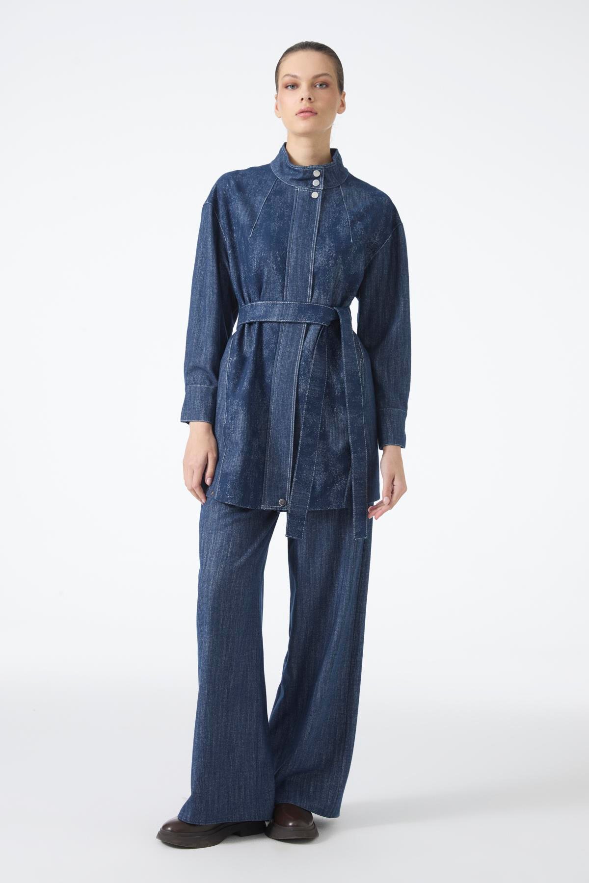 This two-piece set combines the timeless elegance of navy blue with a modern cut, featuring a belted jacket and wide-leg pants. Versatile enough for everyday wear or special occasions, this set offers comfortable wear with its relaxed fit.