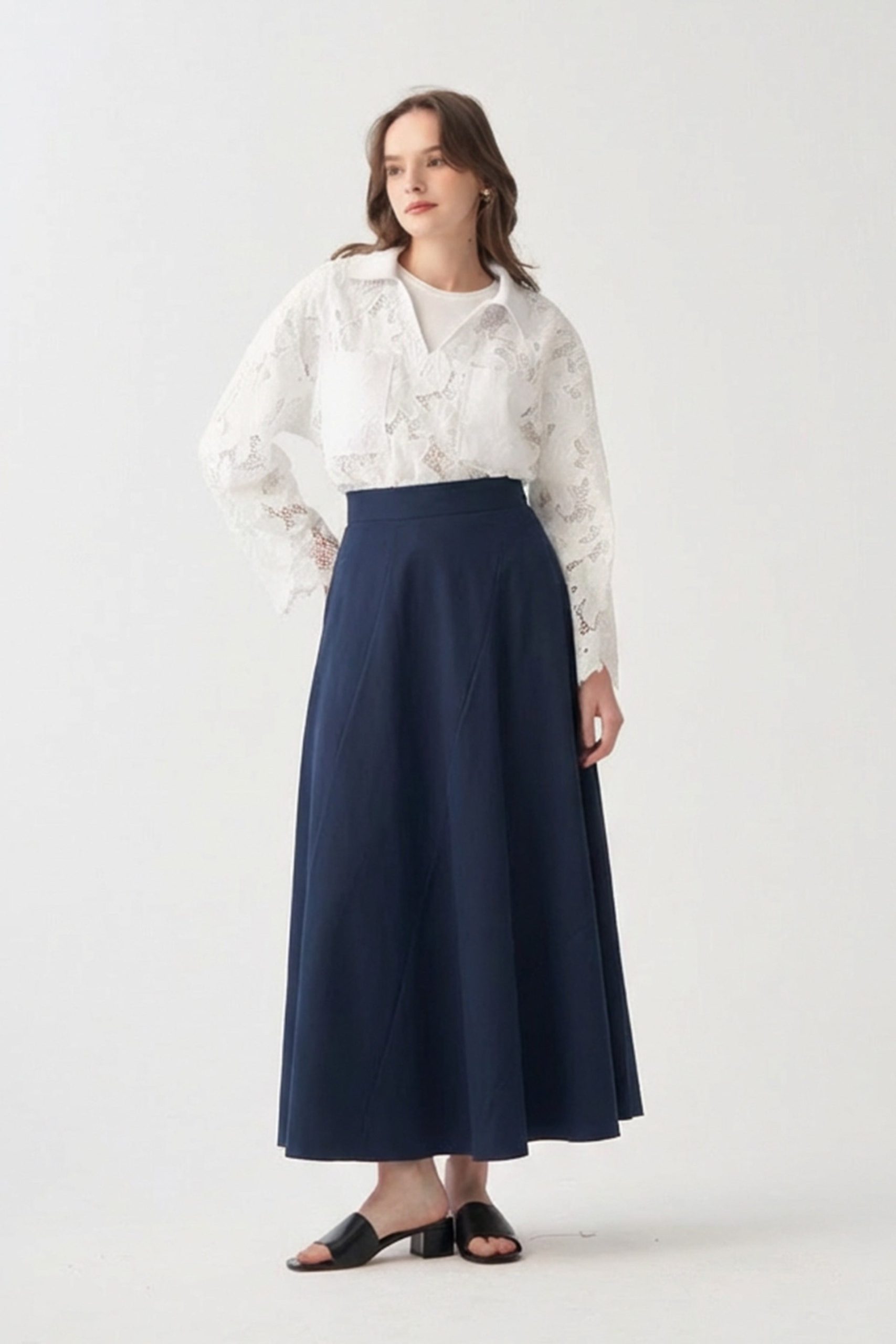 Tags: bias cut, cotton blend, elegant fashion, flare skirt, navy blue skirt, paneled skirt, summer collection