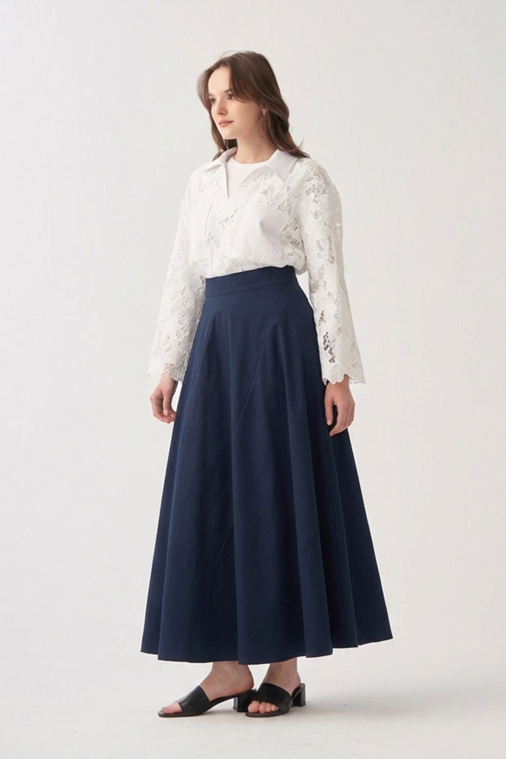 Achieve an elegant look with the Navy Blue Bias-Cut Paneled Skirt, specially designed for those who seek sophistication in details. Ideal for daily wear and special occasions.