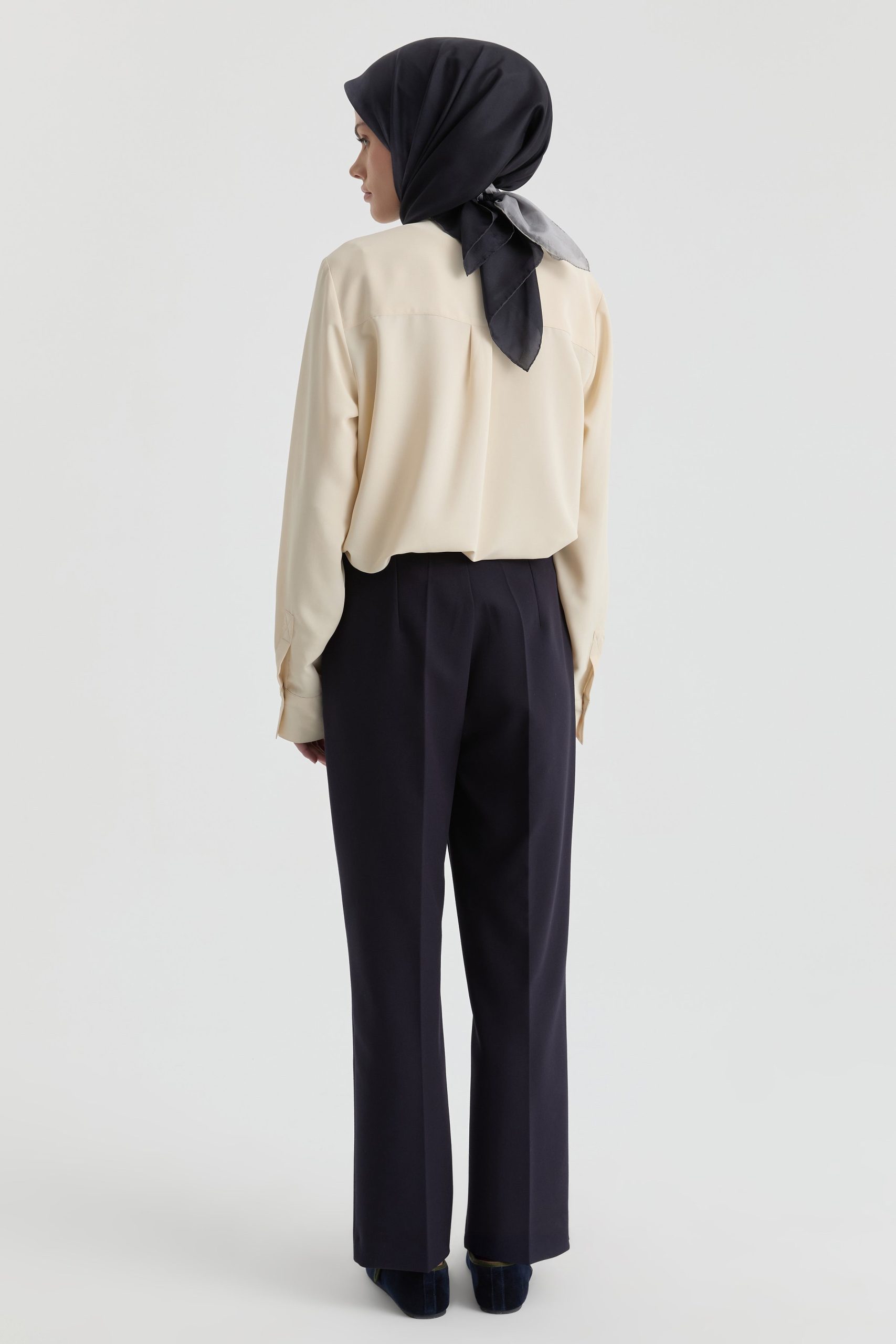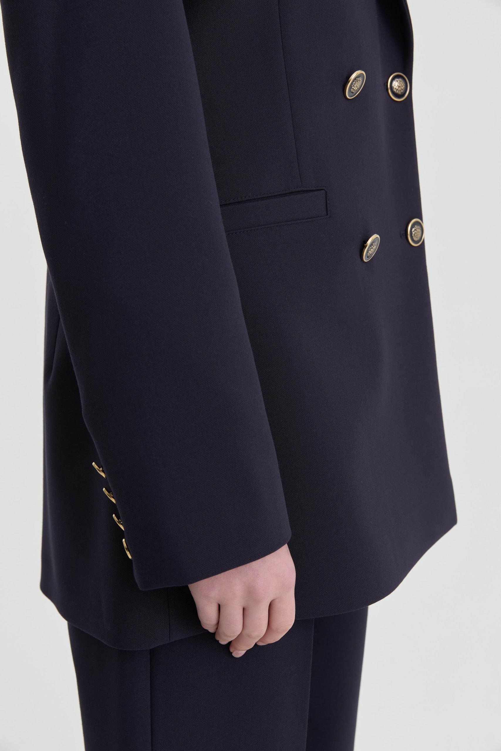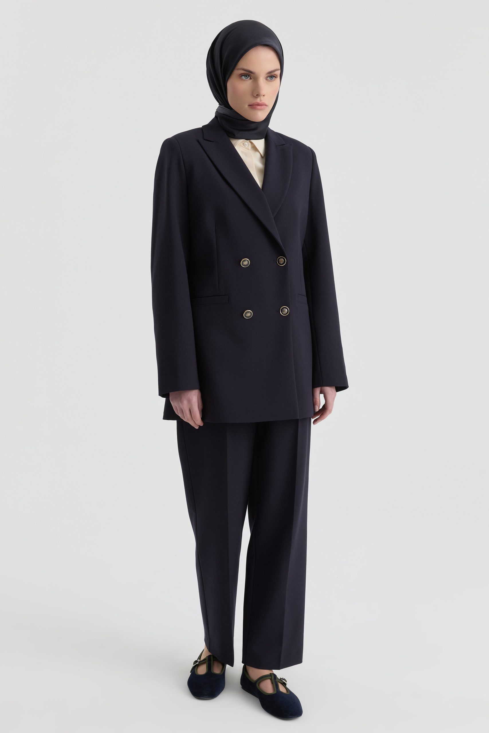This blazer-pants set with elegant gold button details adds a sophisticated shimmer to modern tailoring, offering an architectural silhouette. The structured jacket form creates a powerful stance, while the fluid pant cut completes the silhouette with a balanced and refined line.
