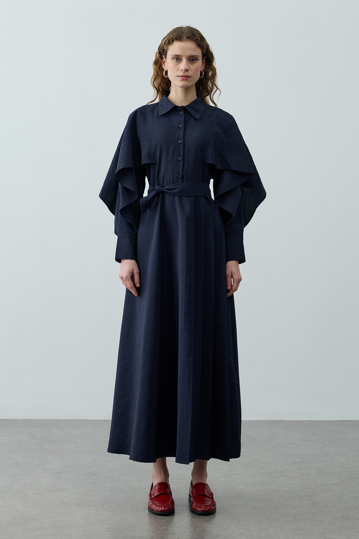 Tags: adjustable belt, cape detail, long sleeve, maxi dress, navy blue, shirt collar, woven fabric