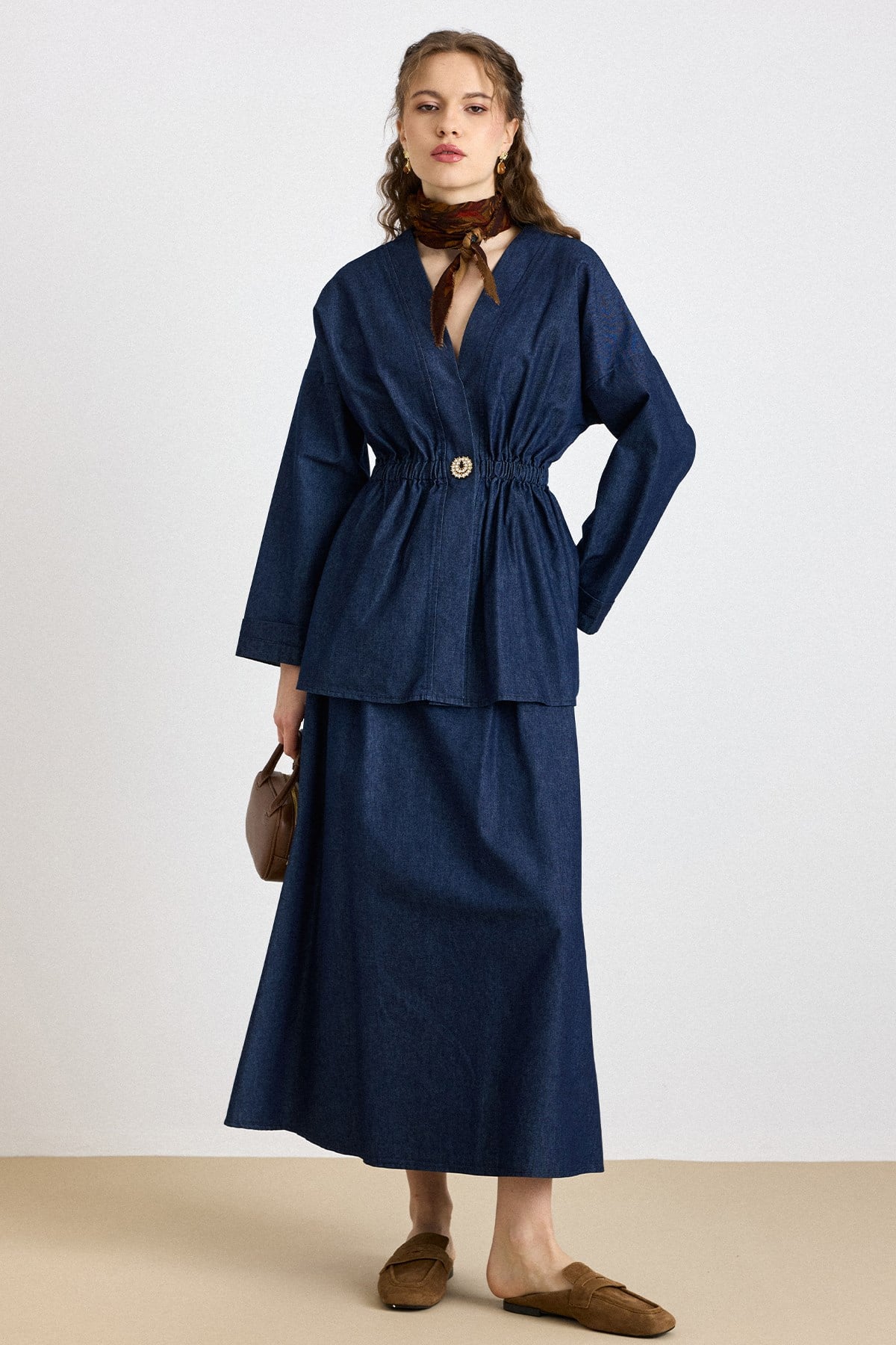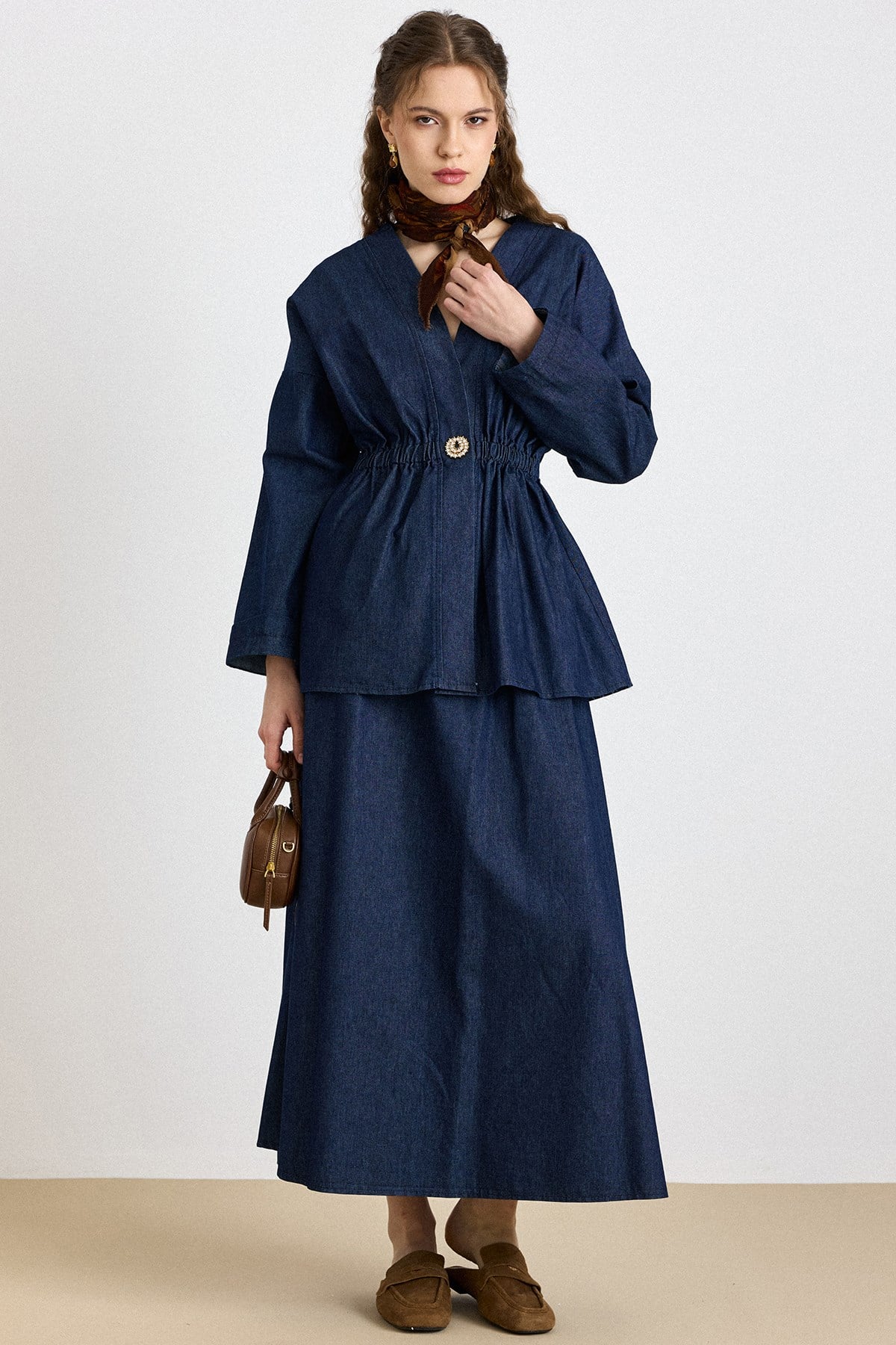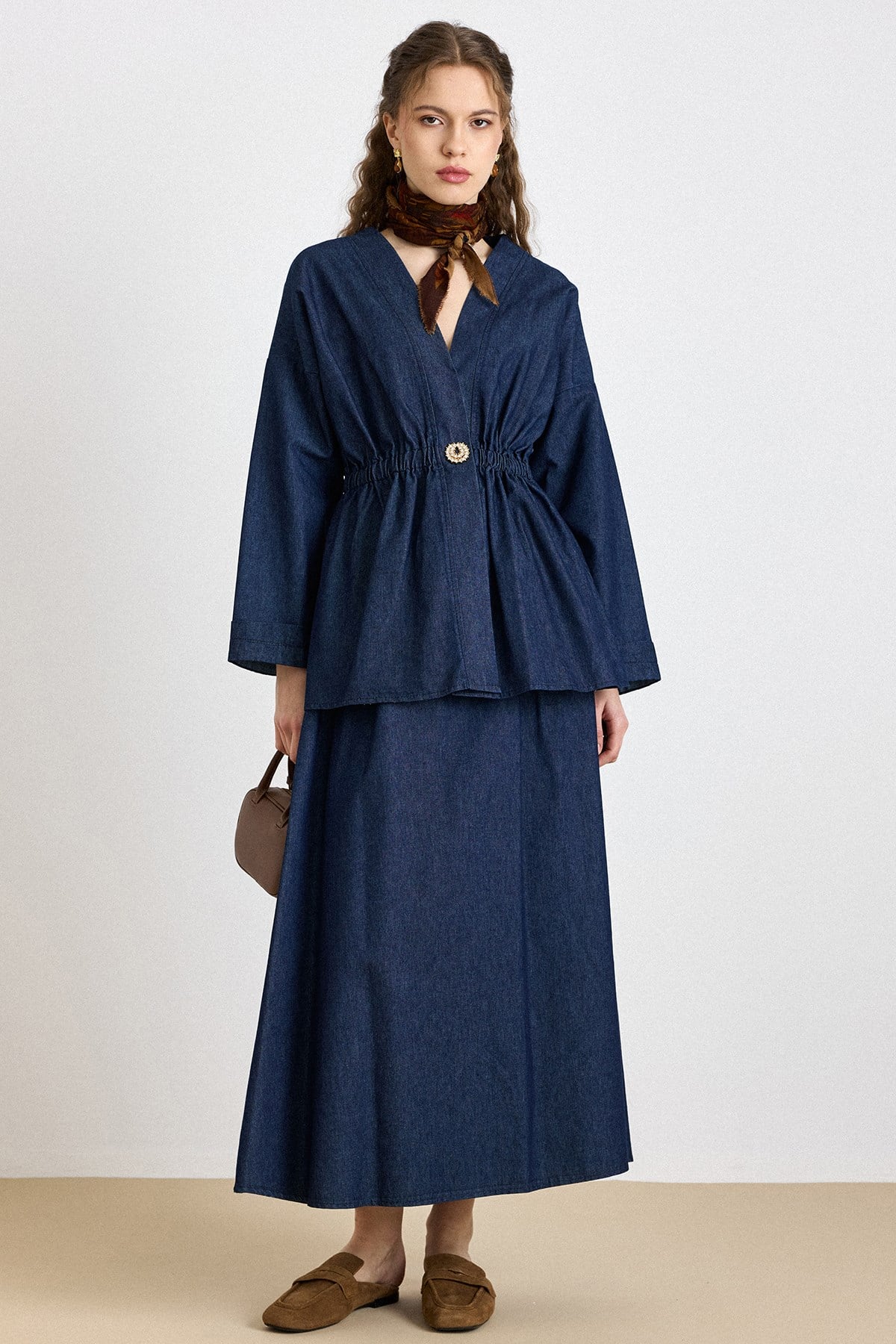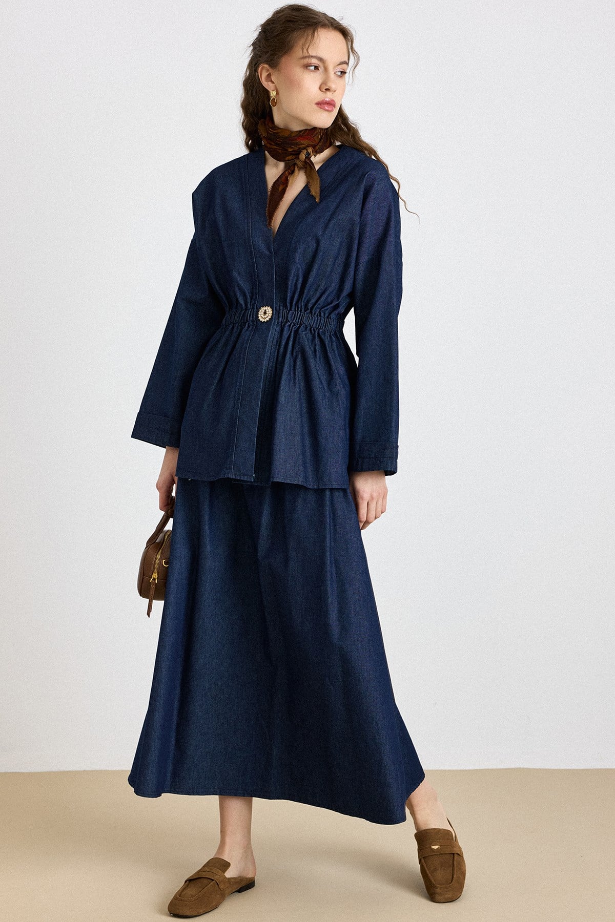 Navy Blue Elastic Stone-Buttoned Jacket Skirt Denim Set 9445-TK