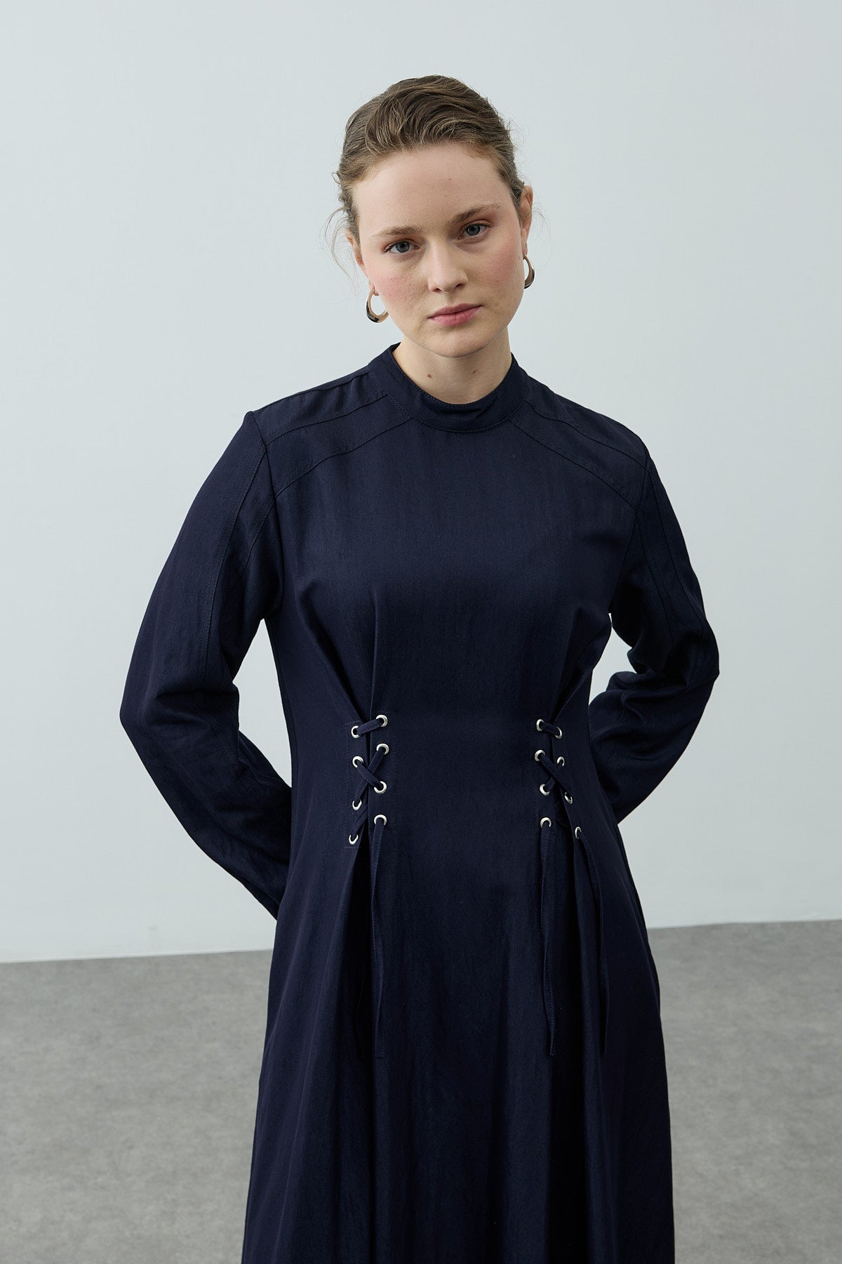 Tags: eyelet, long sleeve, mandarin collar, maxi dress, navy blue, textured fabric, tie waist