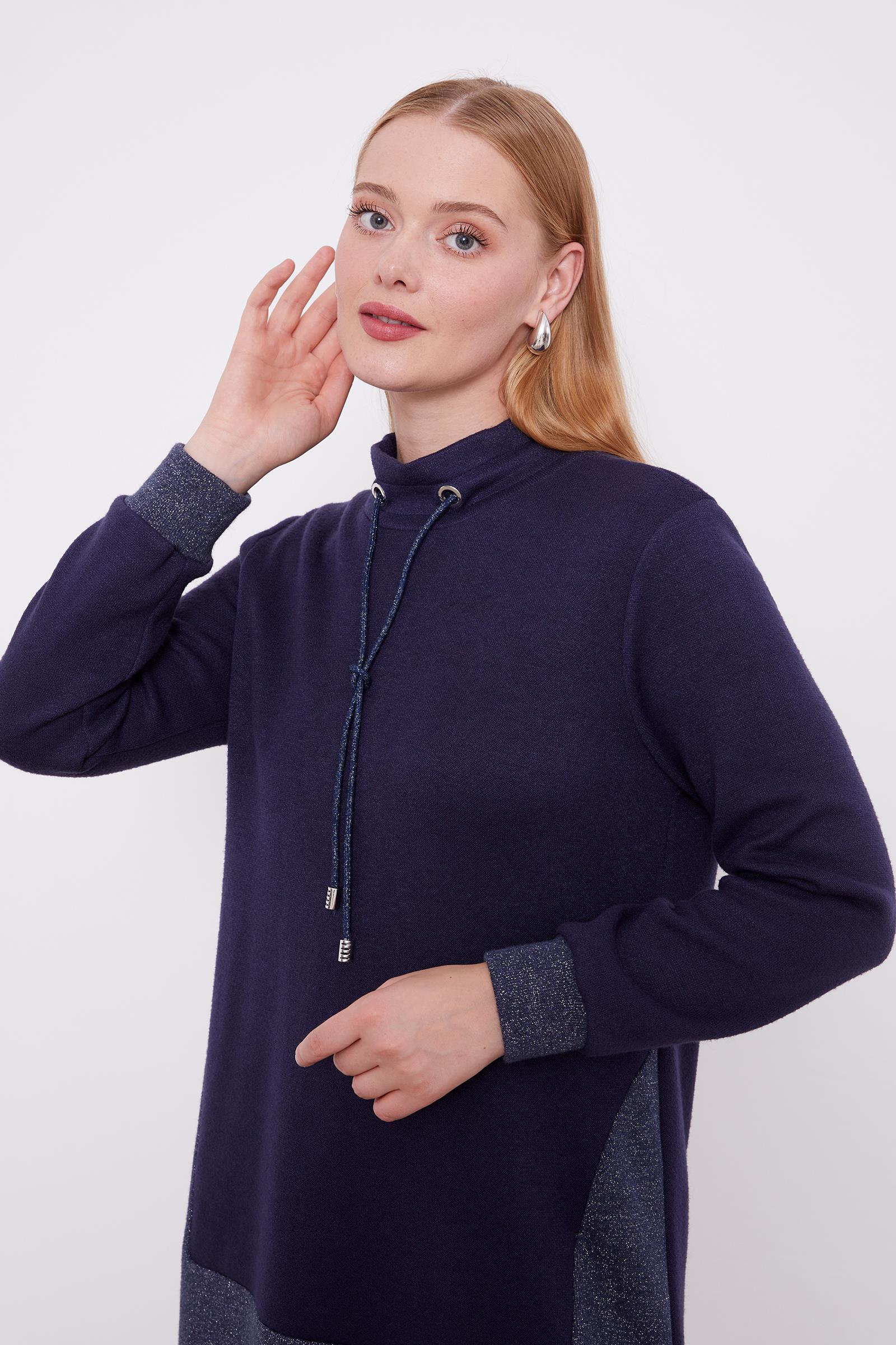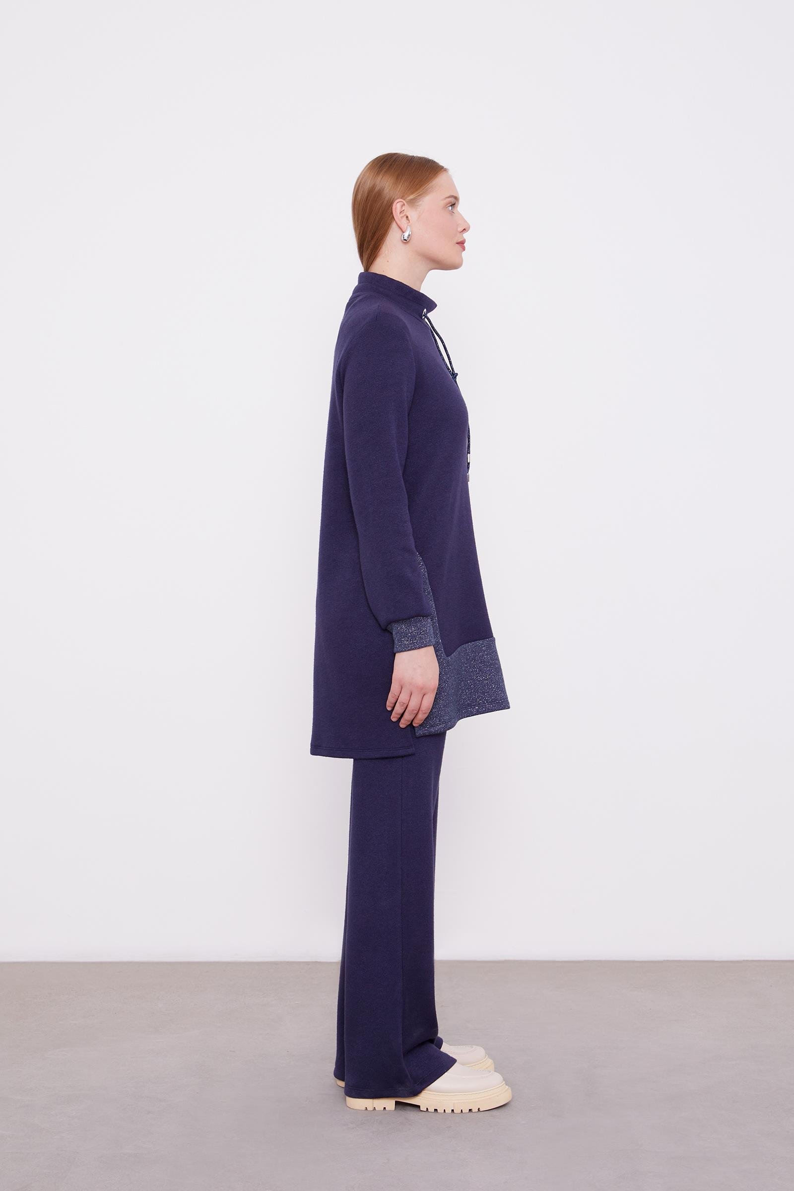 Tags: cashmere set, glitter fabric, navy blue, tunic set, two-piece outfit, wide-leg pants, winter fashion