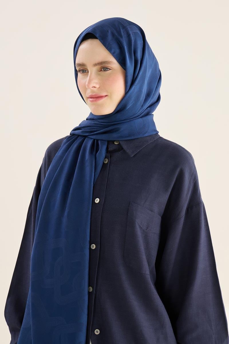 Tags: all-season wear, cotton polyester blend, jacquard shawl, navy blue, spiral pattern, versatile accessory