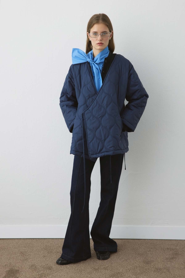 Tags: belted coat, navy blue coat, quilted coat, winter coat, women's outerwear